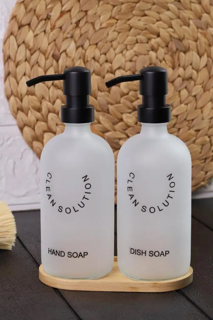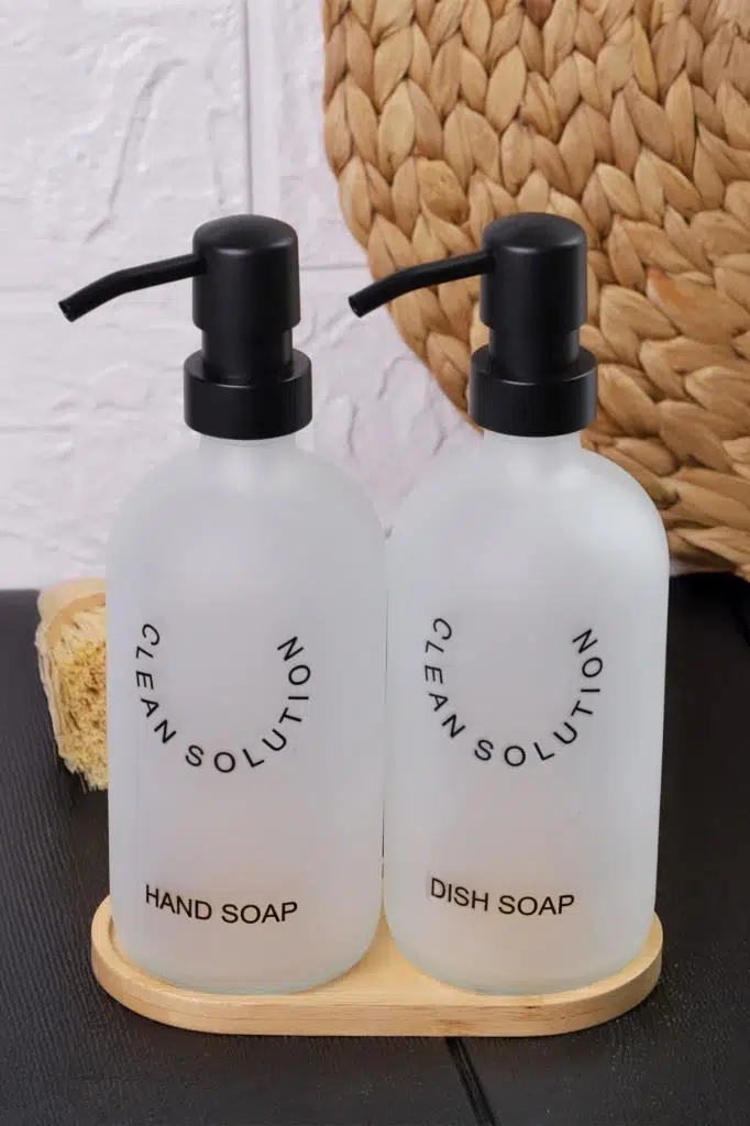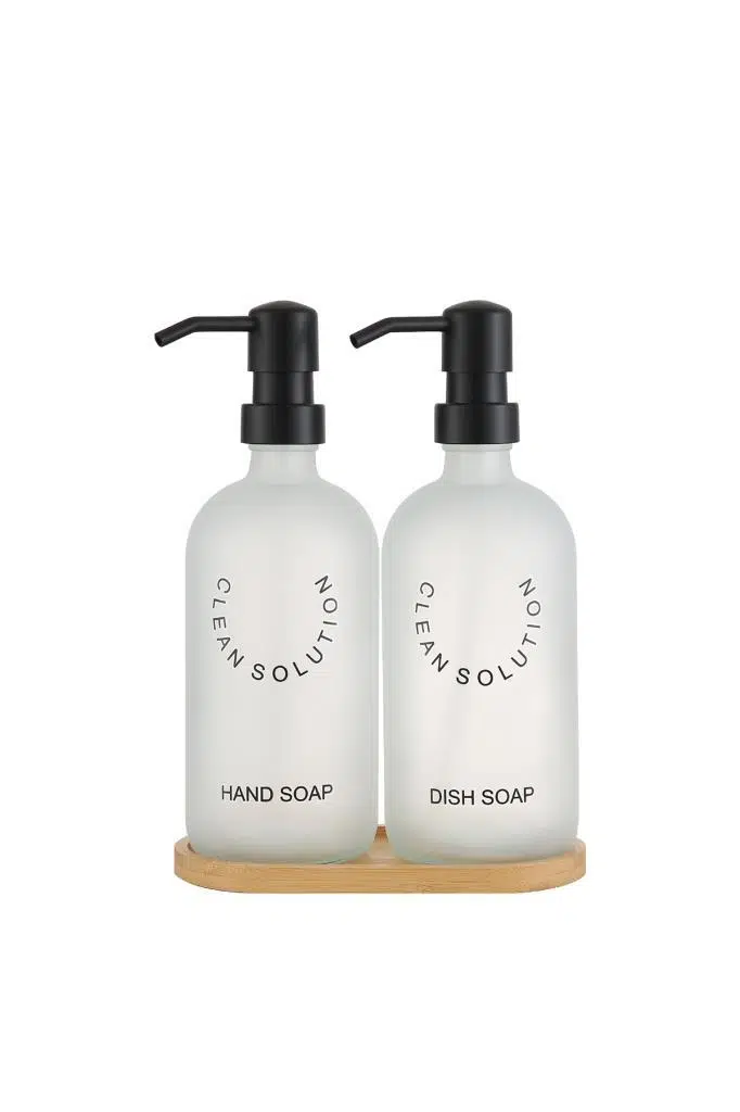 2’li Sablaj Cam Beyaz Sıvı Sabunluk Seti – Standlı | Modern & Şık Tasarım