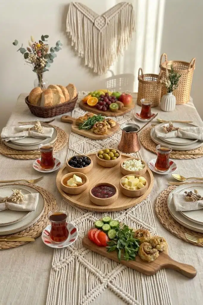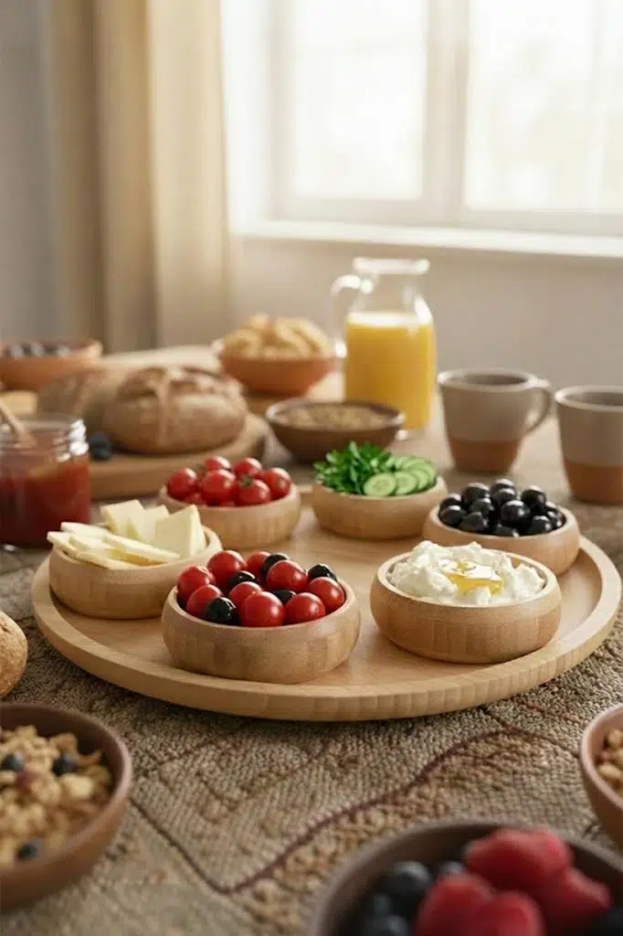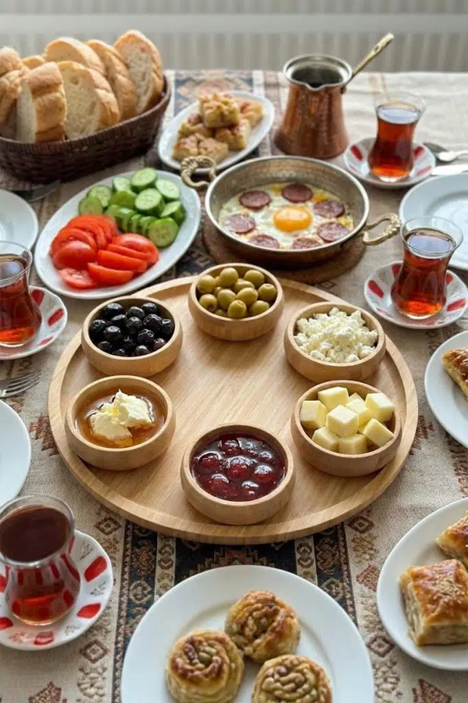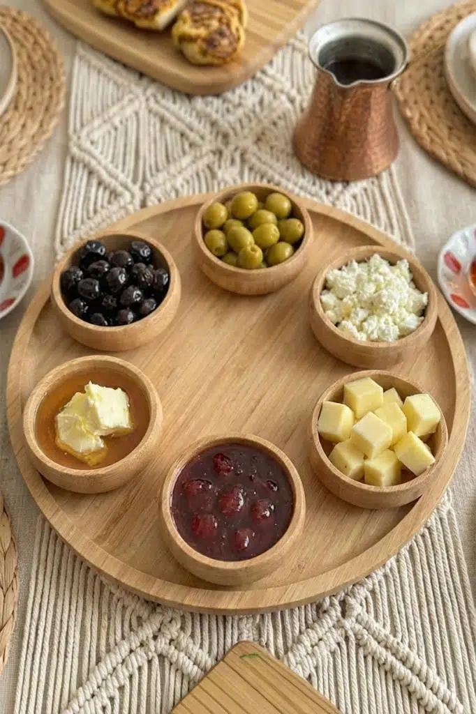 Kahvaltı: Siyah/yeşil zeytin, çeri domates, salatalık, bal-kaymak veya reçel çeşitleri için.