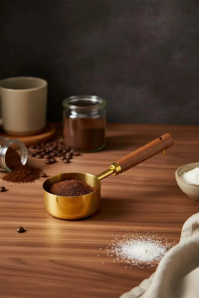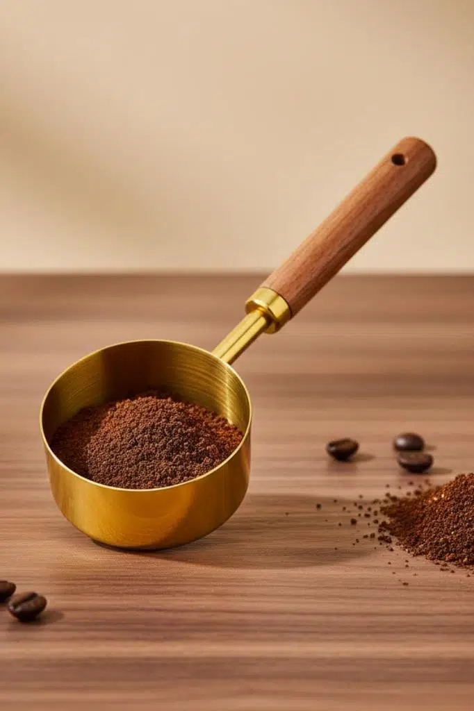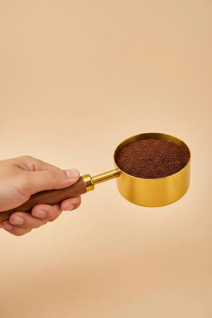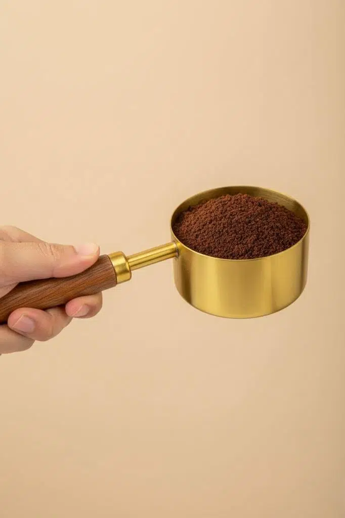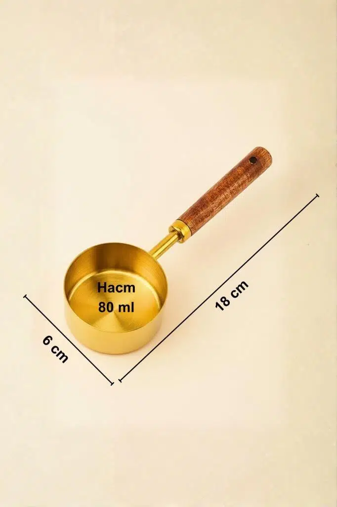 Mutfakta ölçüyü pratikleştiren şık bir yardımcı: ahşap saplı metal ölçü kaşığı. Altın renk metal haznesi ve doğal ahşap sap tasarımıyla hem modern hem sıcak bir görünüm sunar. Kahve, baharat ve kuru gıdaları porsiyonlamak için idealdir; günlük kullanımda hızlı ve düzenli ölçüm yapmanıza yardımcı olur.