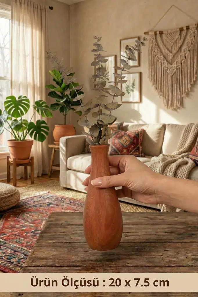 Kullanım Uyarısı: Ürün doğal ahşap olduğu için içerisine doğrudan su konulması önerilmez. Sadece kuru çiçekler, pampas otları veya yapay bitkilerle kullanım için tasarlanmıştır.
