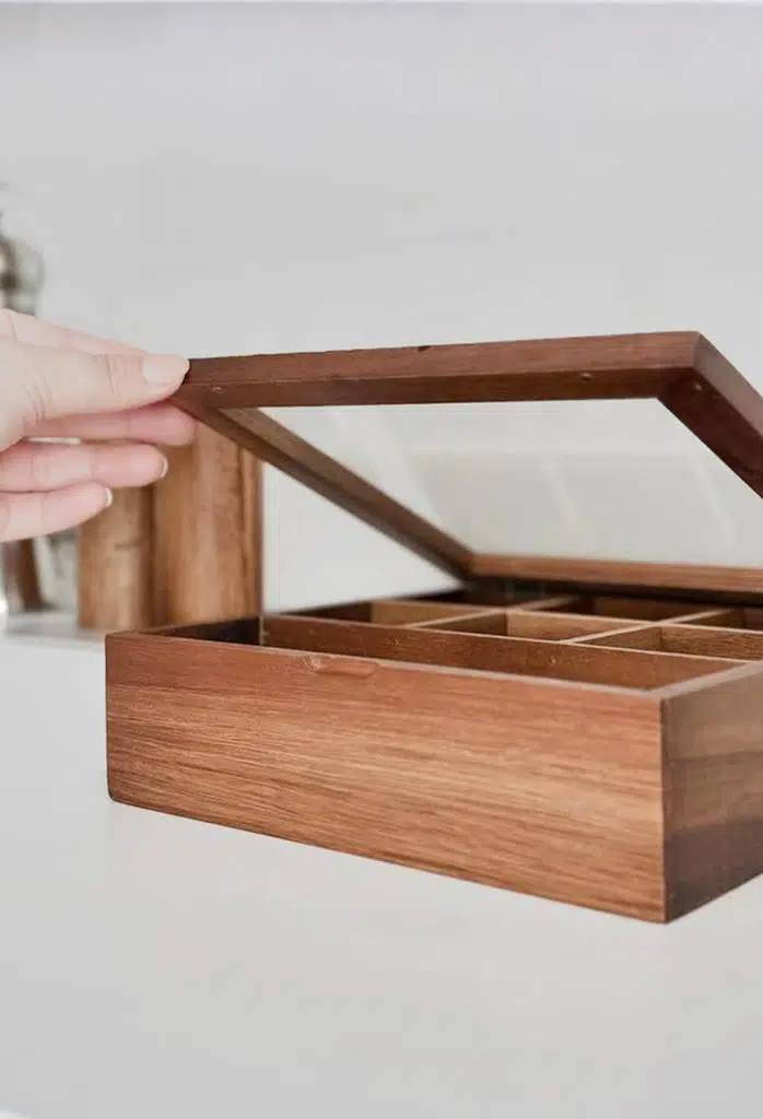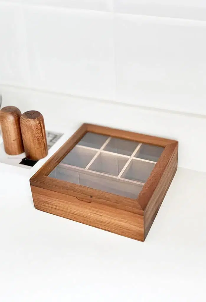 Bu özel tasarıma sahip çay kutusu, farklı çay ve kahve çeşitlerinizi bir arada tutarak size hem pratik hem de şık bir kullanım sunar. Şeffaf kapağı sayesinde içindekileri kolayca görebilir, doğal ahşap dokusuyla mutfağınıza sıcak bir hava katabilirsiniz.