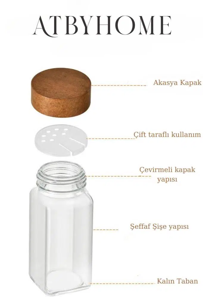 | Etiketler | Akasya Kapaklı 12 Adet Cam Baharatlık Seti 120 ml |