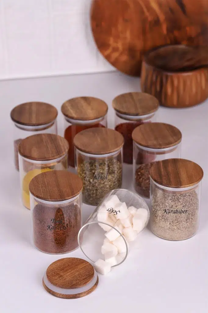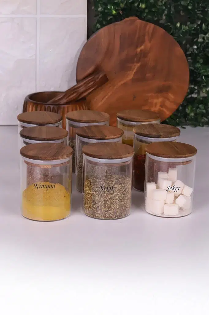 • Set İçeriği: 9 adet cam kavanoz + 9 adet akasya kapak