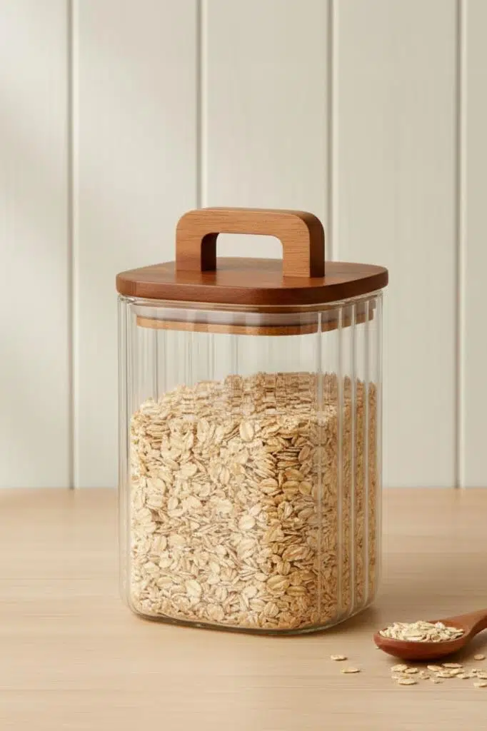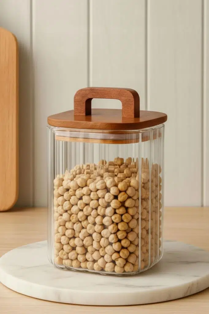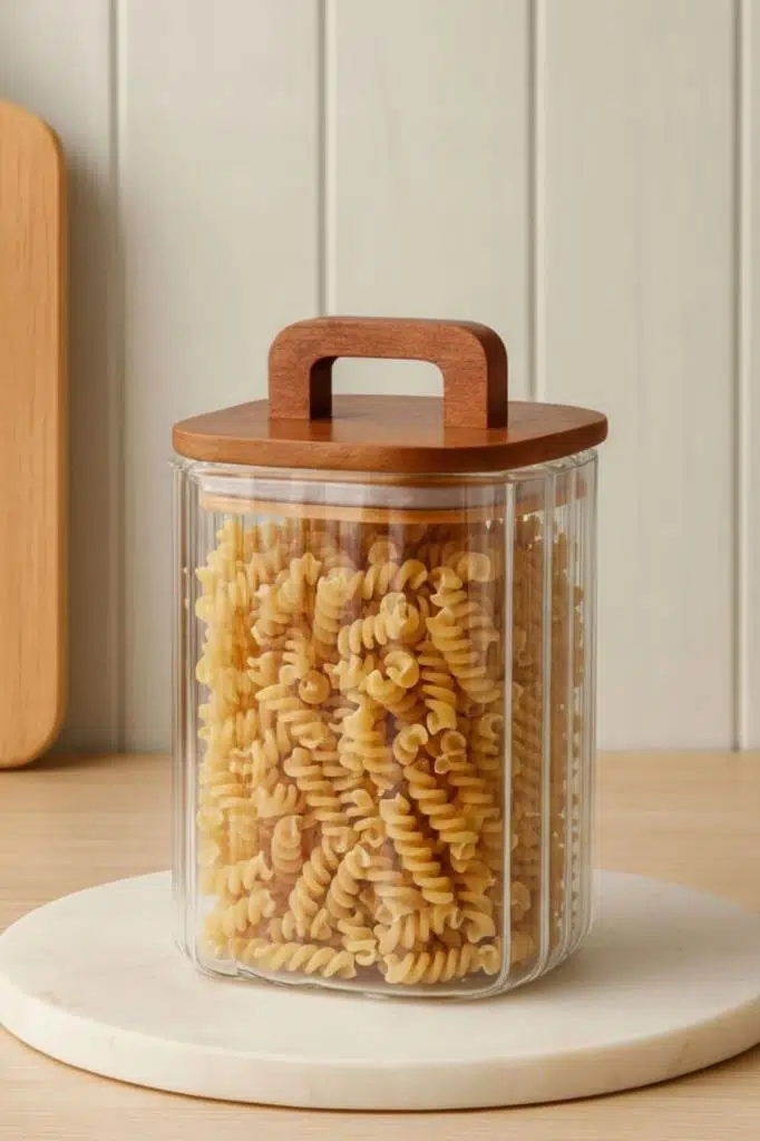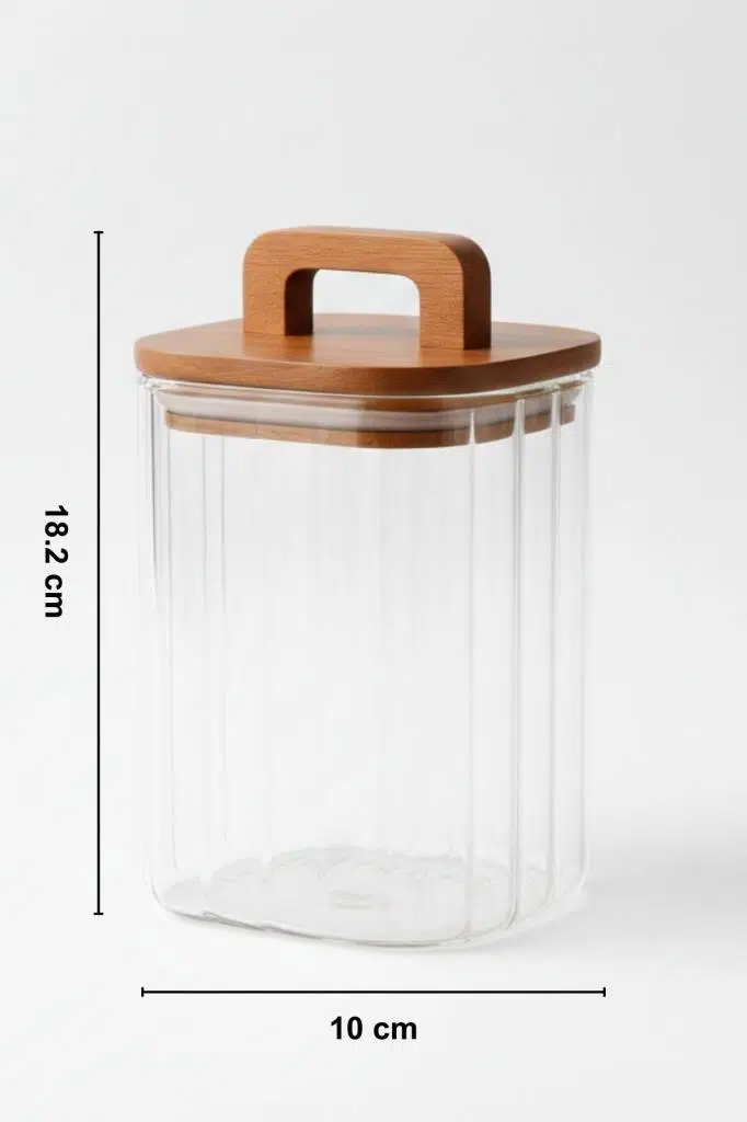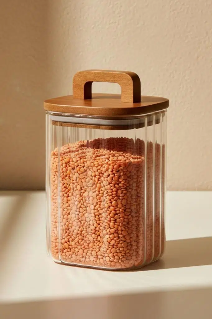 Orta boy 1100 ml hacmi; bakliyatlar (nohut, fasulye, mercimek), makarnalar, kuruyemiş, kahve, çay, şeker, tuz, baharatlar, yulaf, granola gibi birçok ürün için idealdir. Günlük kullanımda tezgâh üstünde de güzel durur; sade, modern ve doğal mutfak dekoruna uyum sağlar.