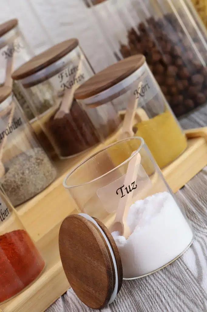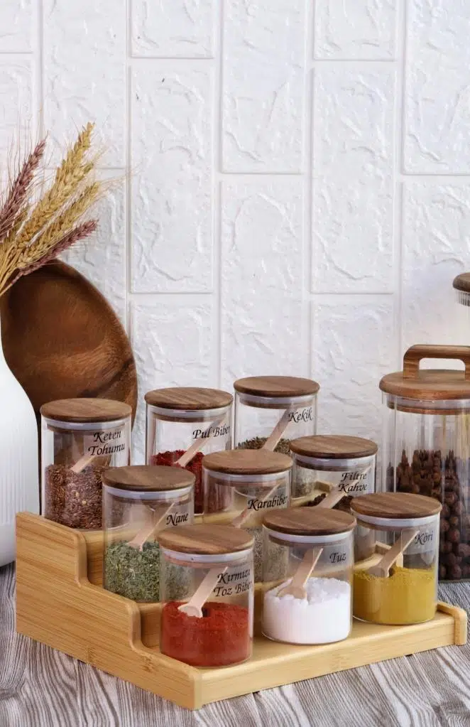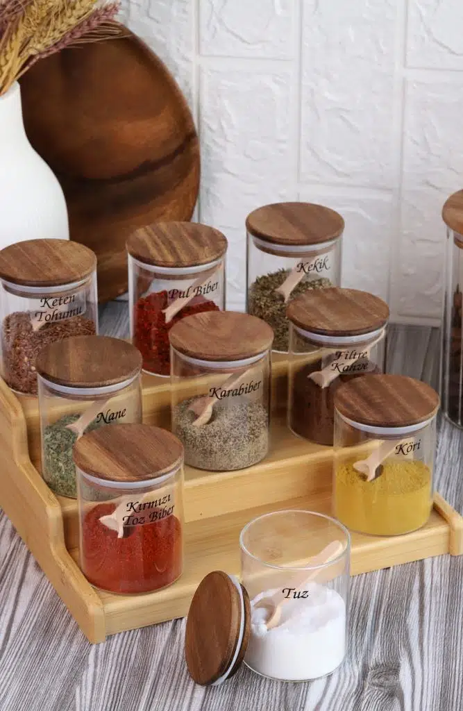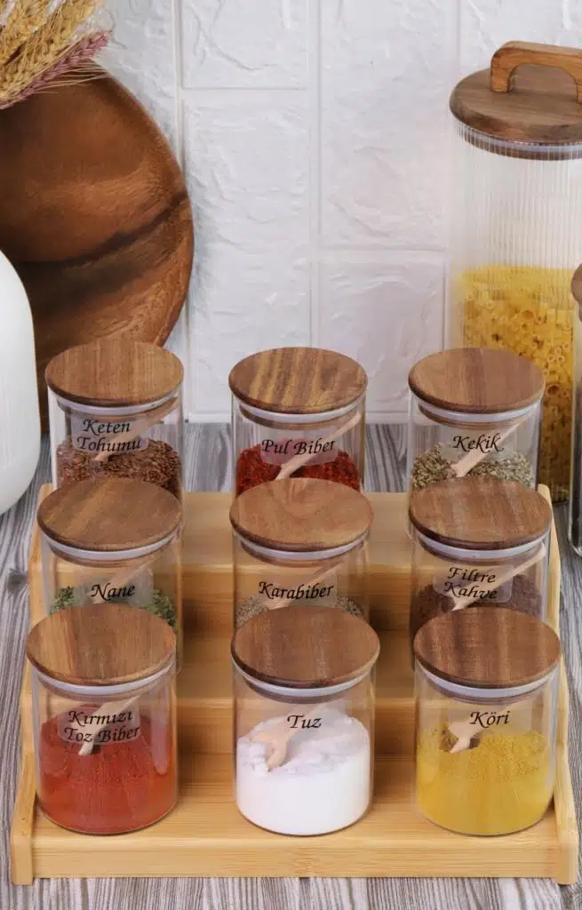 Doğallığı ve fonksiyonelliği bir araya getiren bu özel baharatlık seti, mutfağınıza estetik bir düzen kazandırırken aynı zamanda uzun ömürlü ve hijyenik kullanım sunar. Şık bambu standı ve sızdırmaz silikon kapakları ile pratikliğin yanında görsel bir zarafet de getiriyor.