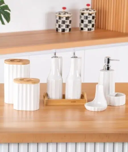 Aria 6'lı Mutfak Seti, mutfak tezgahınızda yer tasarrufu sağlarken, aynı zamanda fonksiyonel ve şık kullanım sunar. Her parça, mutfak ihtiyaçlarınıza göre tasarlanmış olup, estetik bambu detayları ile doğal bir zarafet katmaktadır. Bu set, mutfağınızda hem düzeni hem de şıklığı bir arada sunmak için mükemmel bir tercihtir.