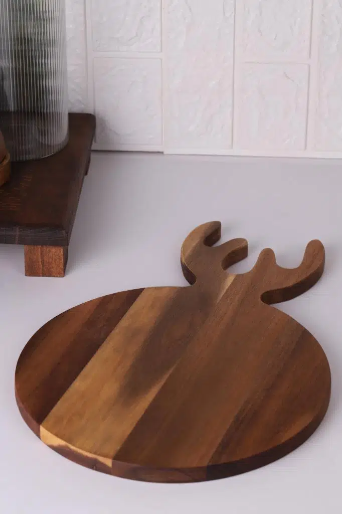 Atby Akasya Doğal Ahşap Geyik Kesim Panosu, 38x26x1.5 cm ölçüleriyle mutfakta geniş ve rahat bir kullanım alanı sunar. Doğal akasya ağacının sağlamlığı sayesinde et, meyve ve sebzelerinizi kolayca kesebilir, aynı zamanda sofralarınızda estetik sunumlar yapabilirsiniz. Geyik figürüyle özel olarak tasarlanan bu kesim panosu, hem fonksiyonel hem de dekoratif bir mutfak aksesuarıdır.