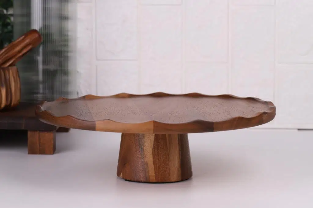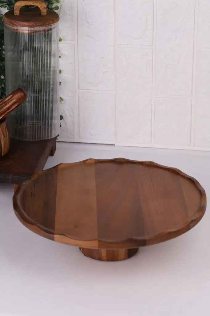 Sofralarınıza doğallık ve zarafet katın! Atby Akasya Pasta Standı, 30x9 cm ölçülerinde olup, pastalarınızı, keklerinizi ve tatlı sunumlarınızı şık bir şekilde sergilemeniz için tasarlanmıştır. %100 doğal Akasya ağacından üretilmiş dayanıklı yapısı ve doğal ahşap dokusu ile sofralarınıza sıcak ve estetik bir hava katar.
