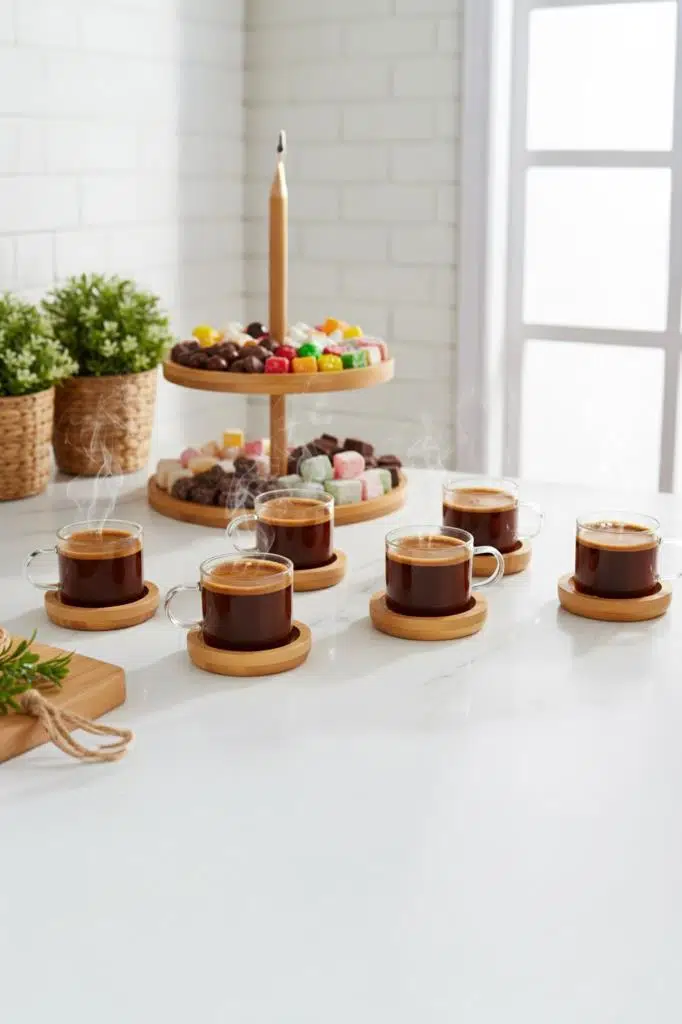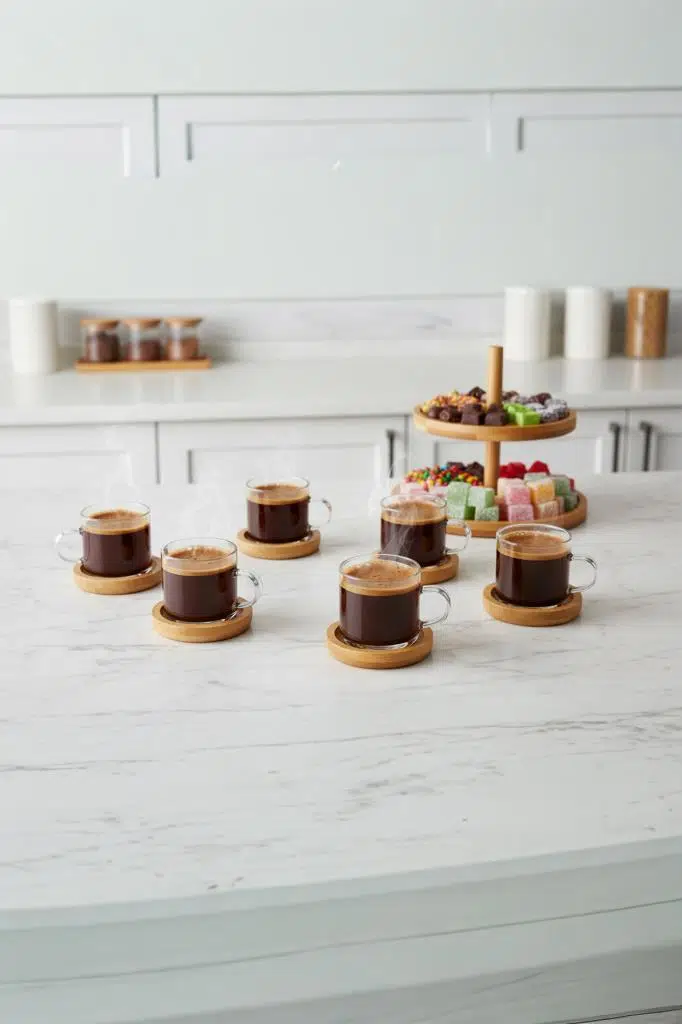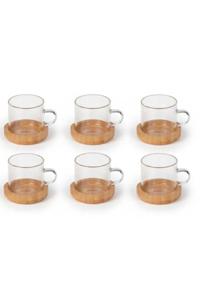 Malzeme: Yüksek kaliteli, ısıya dayanıklı Cam (Fincanlar) ve %100 Doğal Bambu (Altlıklar).