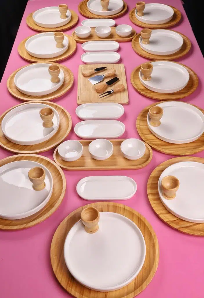 Doğallığı, zarafeti ve fonksiyonelliği bir arada sunan bu özel kahvaltı takımı, 12 kişilik geniş aile sofraları ve kalabalık davetler için ideal! Doğal bambu malzemenin sıcaklığı ile şık seramik detayların buluştuğu bu set, kahvaltı sofralarınıza hem estetik hem de konfor katar.