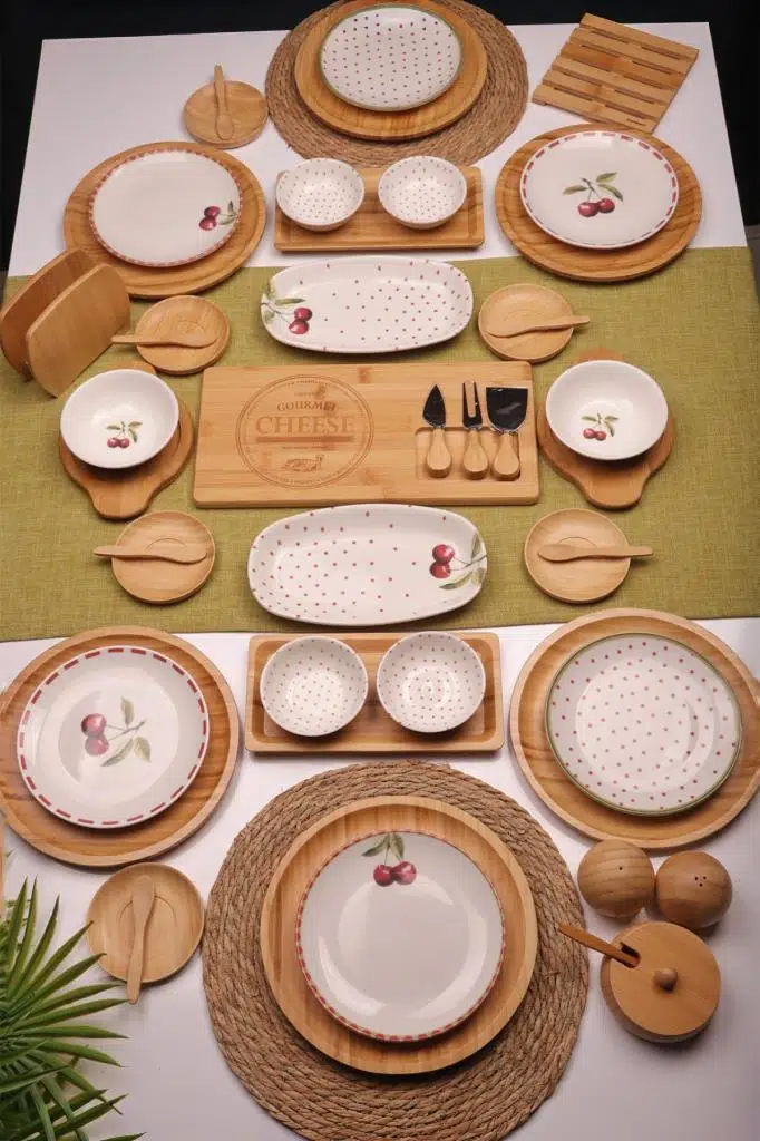 kahvaltı takımı, 47 parça kahvaltı seti, bambu kahvaltı takımı, kirazlı tabak takımı, çeyiz seti, peynir sunum tahtası, bambu tuzluk biberlik, Atbyhome Shine, 6 kişilik yemek takımı, puantiyeli kahvaltı seti