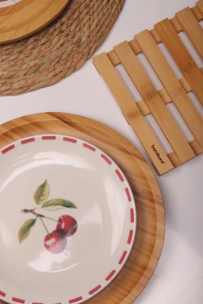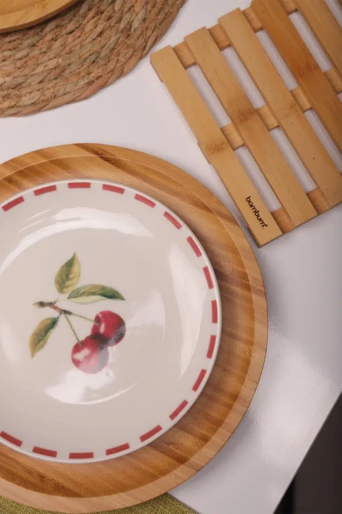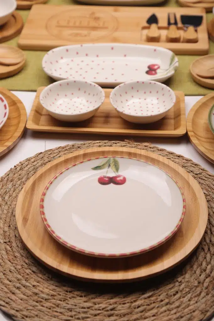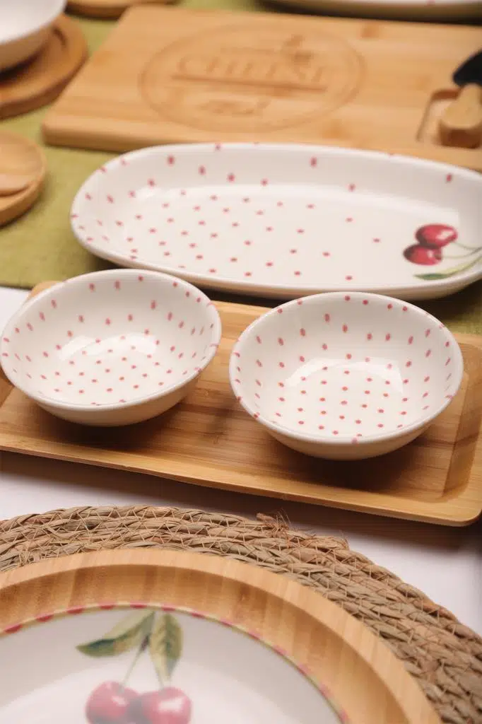 Tasarım: "Shine" serisi, Retro ve Country tarzını yansıtan kiraz/puantiye desenleriyle sofraya pozitif bir enerji katar. Bambu parçalarla birleşerek sıcak ve samimi bir atmosfer yaratır.