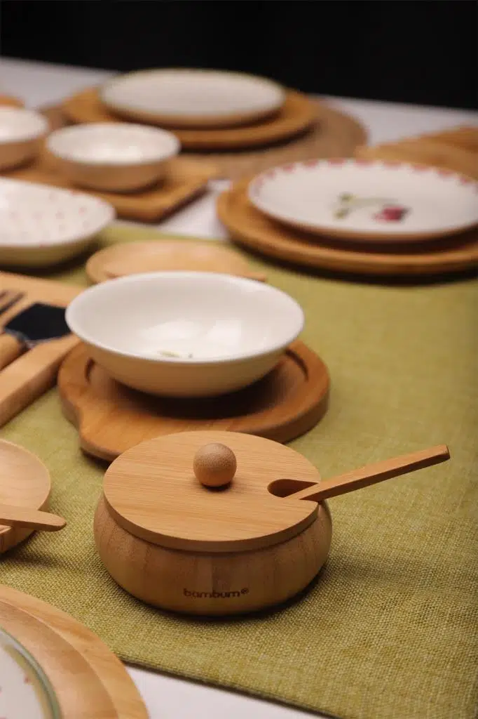 3 Parça Bambu Gocce Şekerlik (10.5x5.5 cm) – Kapaklı ve kaşıklı şık tasarım.