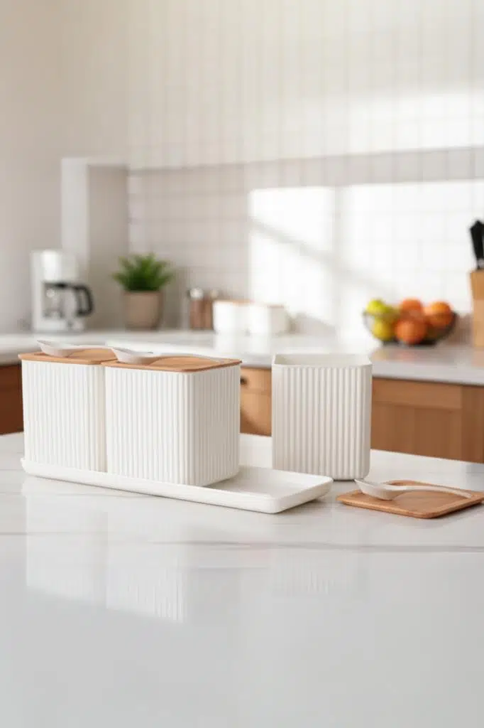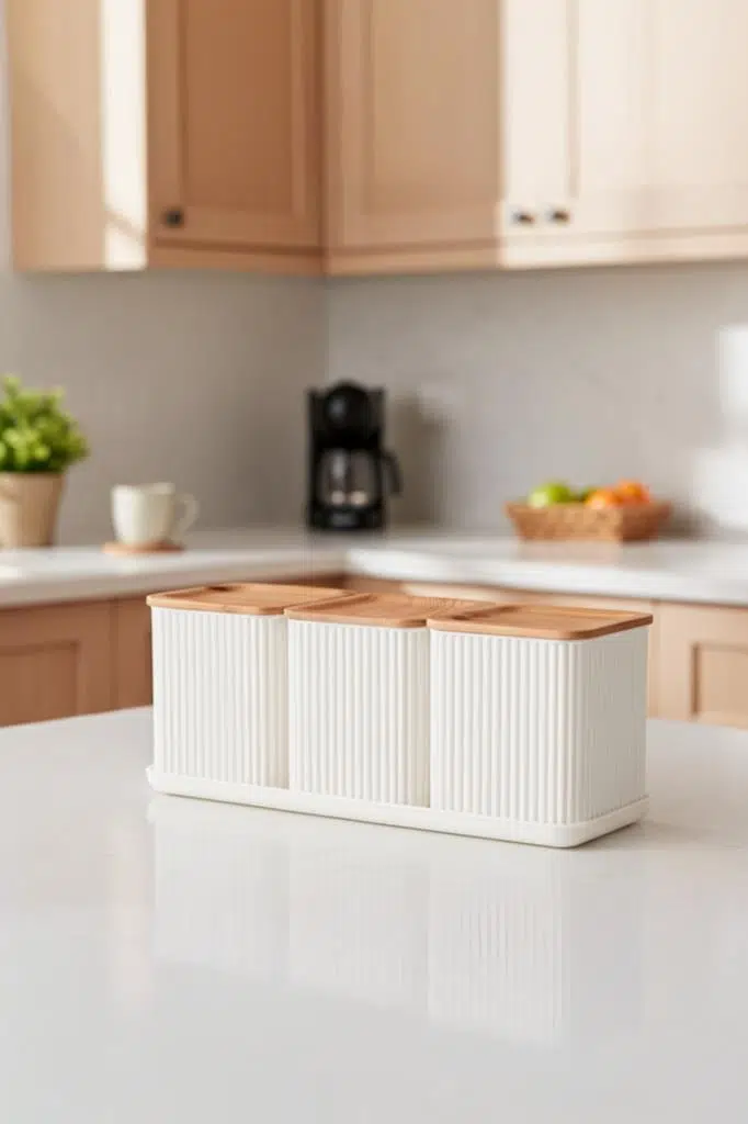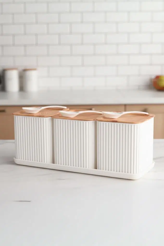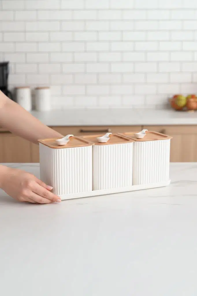 Hepsi Bir Arada Düzen: Üç kavanozu, kaşıkları ve özel tepsisi ile en çok ihtiyaç duyduğunuz gıdaları tek bir şık stant üzerinde, dağınıklık yaratmadan elinizin altında tutar.