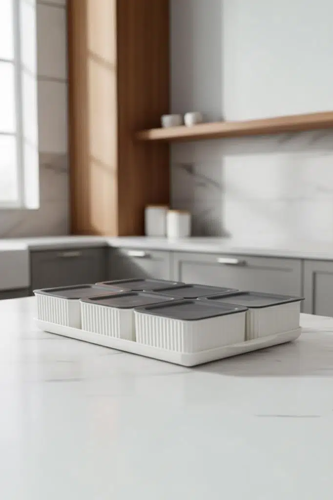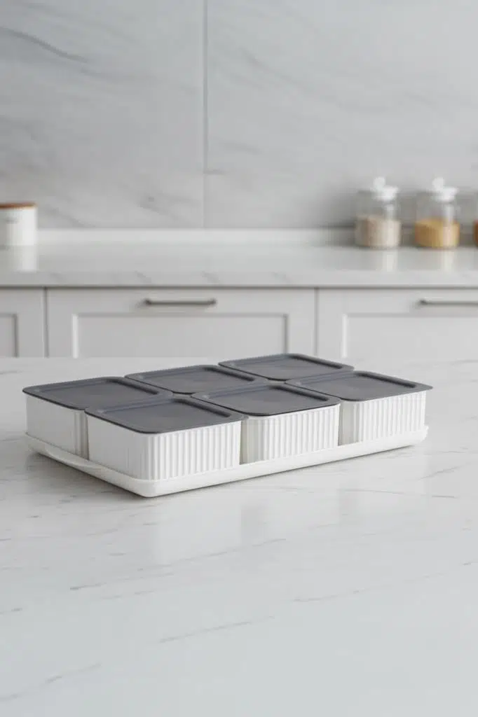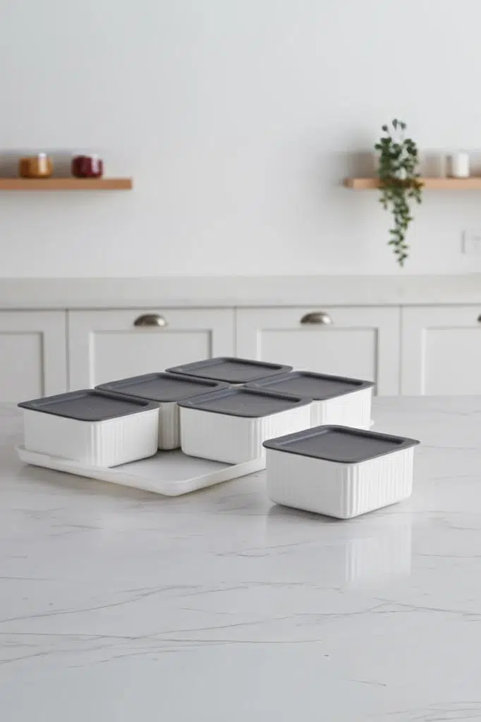 Malzeme: Yüksek kaliteli, dayanıklı plastik. Kaseler beyaz, kapak ve tepsi modern gri görünümlüdür.