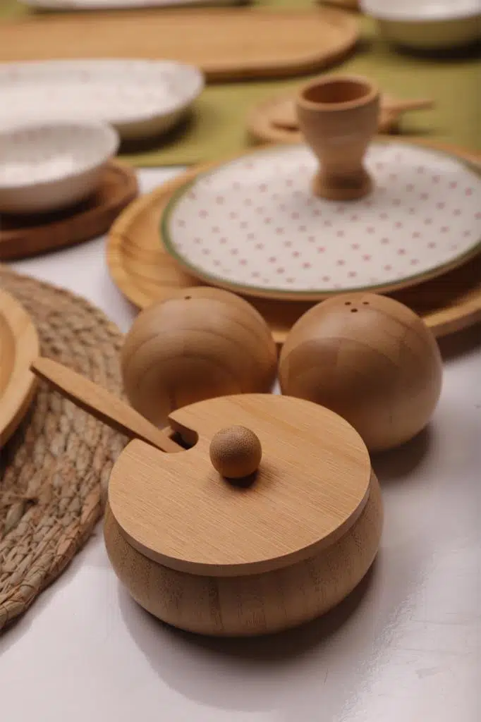 3 Parça Bambu Gocce Şekerlik (10.5x5.5 cm) – Kapaklı ve kaşıklı şık tasarım.