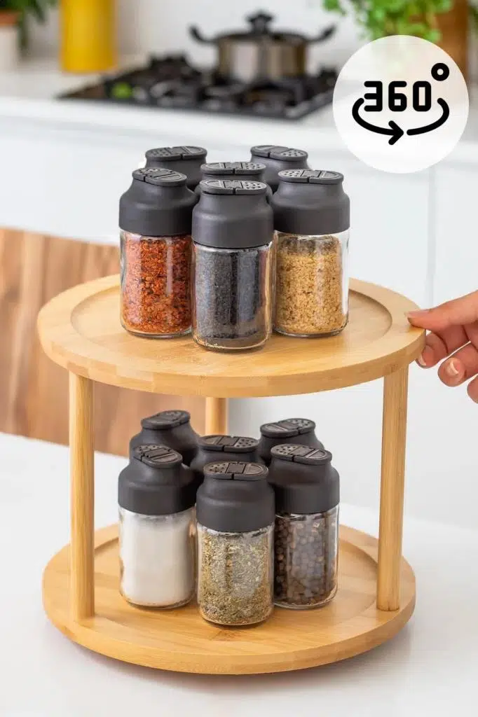 Ürün Özellikleri: 360° Döner Standlı Bambu SunumlukOrganizer, fonksiyonellik ve estetiği bir araya getiren şık bir organizasyon çözümüdür.