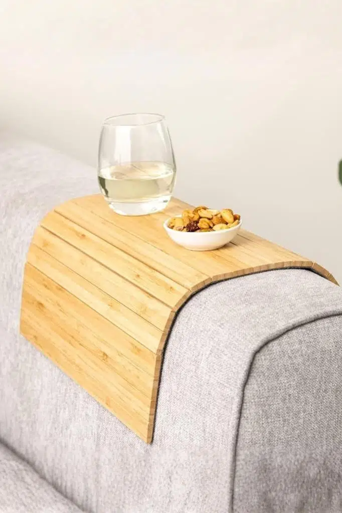 Koltuk keyfini bölmeden içeceğinizi, atıştırmalığınızı veya kumandanızı elinizin altında tutun. Esnek lamelli bambu yapısı sayesinde farklı koltuk kolu formlarına kolayca uyum sağlayan bu kolçak sehpası, küçük alanlarda pratik bir mini sehpa çözümü sunar. Film geceleri, laptopla kısa işler, kahve/çay molaları ve günlük kullanım için idealdir.