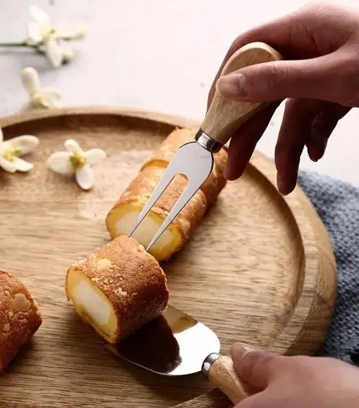 Bir parmesan bıçağı, yassı peynir bıçağı, dar düzlem bıçağı ve peynir çatalı içerir. ;