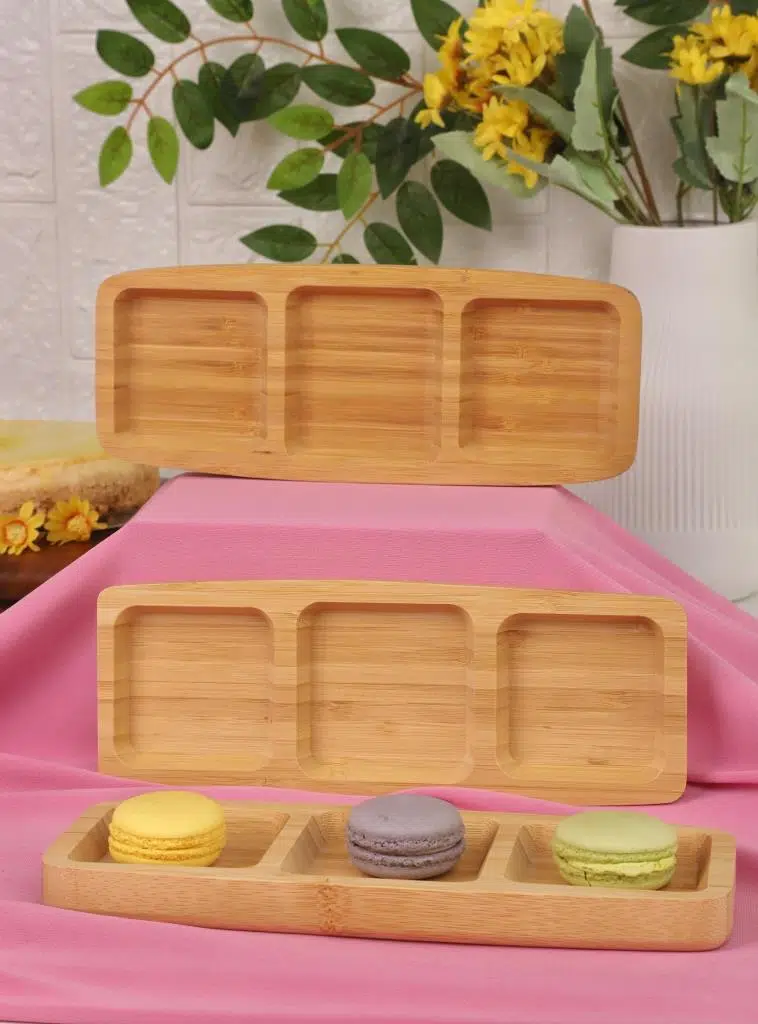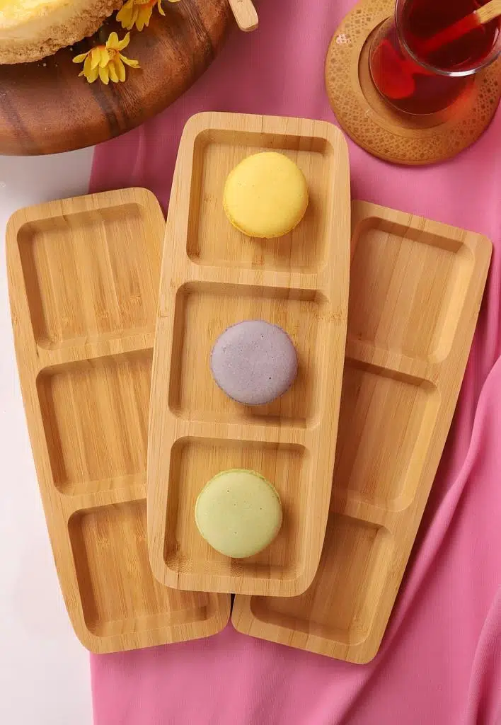 3 bölmeli bambu servis tabağı, dikdörtgen bambu tabak, kahvaltı sunum tabağı, meze ve atıştırmalık tepsisi, bölmeli bambu tabak, doğal bambu mutfak gereçleri, şık sunum tepsisi
