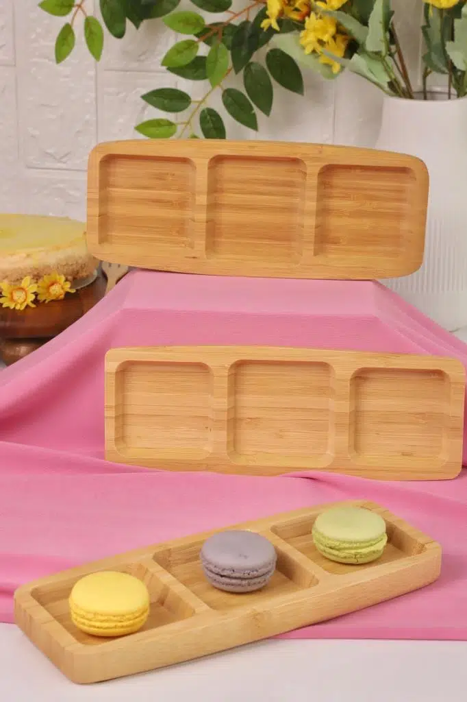 3 adet 3 bölmeli bambu dikdörtgen servis tabağı