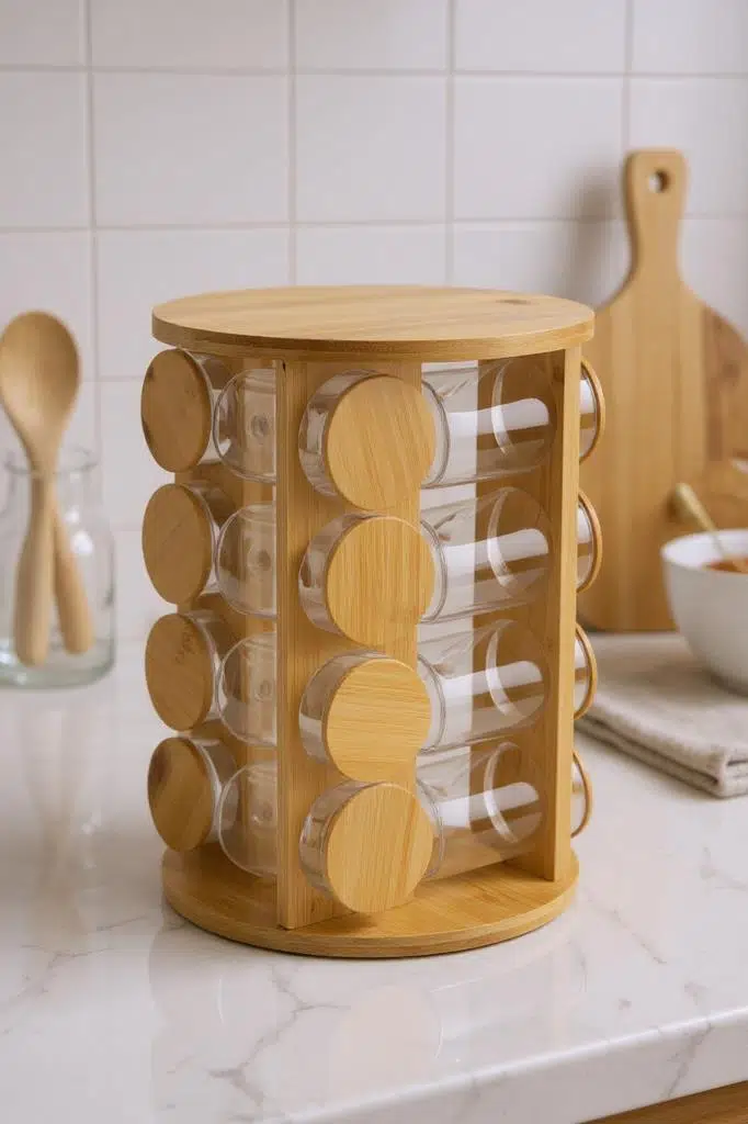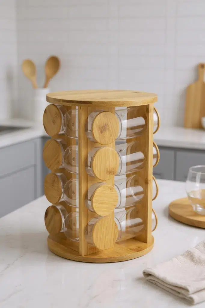 Mutfak tezgahınızda yer kaplayan baharat poşetlerine ve kavanoz karmaşasına şık bir çözüm! Bambum Atina, dikey tasarımıyla minimum alanda maksimum depolama sağlayan 16'lı bir organizasyon kulesidir. %100 doğal bambu standı, kendi ekseni etrafında 360 derece dönebilen mekanizması sayesinde yemek yaparken aradığınız lezzete saniyeler içinde ulaşmanızı sağlar.