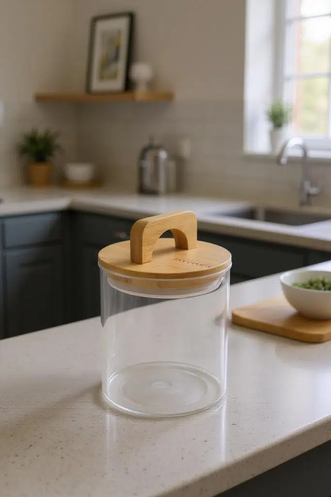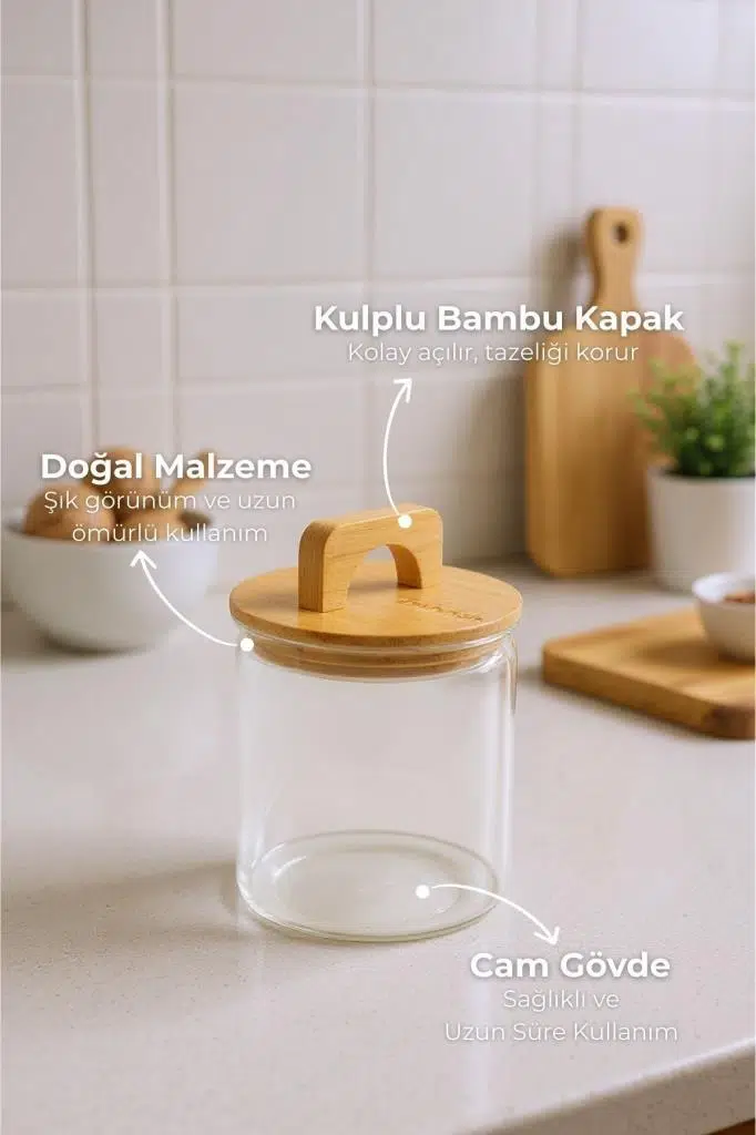 Tasarım: Şeffaf cam gövdesi ile içindeki gıdayı gösterir, mutfak raflarınıza ve tezgahınıza modern bir görünüm kazandırır. Bambu kapağındaki silikon conta, hava almasını önleyerek tazeliği uzun süre korur.