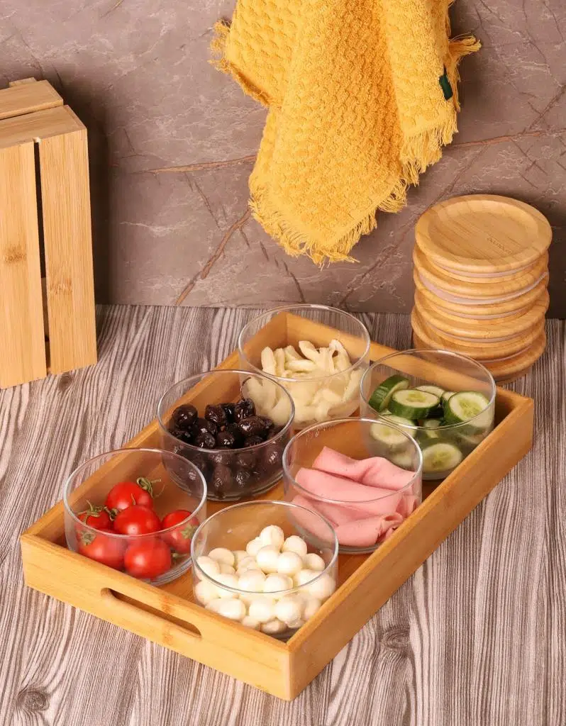 Yuvarlak dönen tepsili setten de almıştım birbirine eş olur diye dikdörtgen tepsiliyi de tercih ettim ama maalesef 6 kase tam sığmıyor. Biri havada kalıyor onu dışında şık kase boyutları güzel