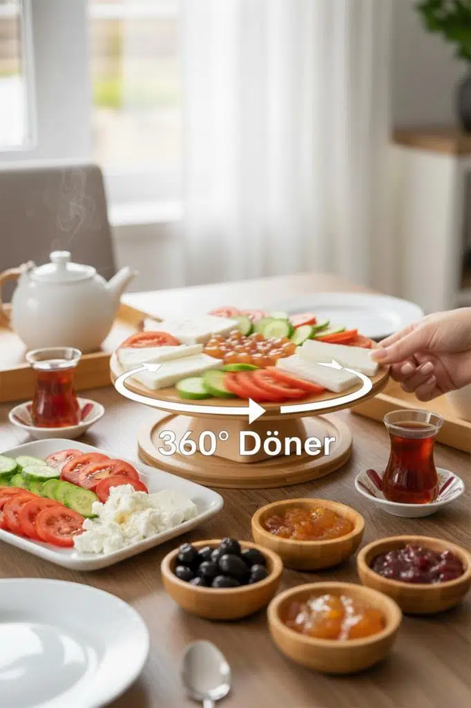 Dönen mekanizması, sofrada herkesin kolayca tabağa ulaşmasını sağlarken, ayaklı yapısı sayesinde masa üstünde yükselerek sunuma şıklık katar. Modern tasarımı ve bambu dokusunun sıcaklığı, hem klasik hem çağdaş mutfaklarla mükemmel uyum sağlar.