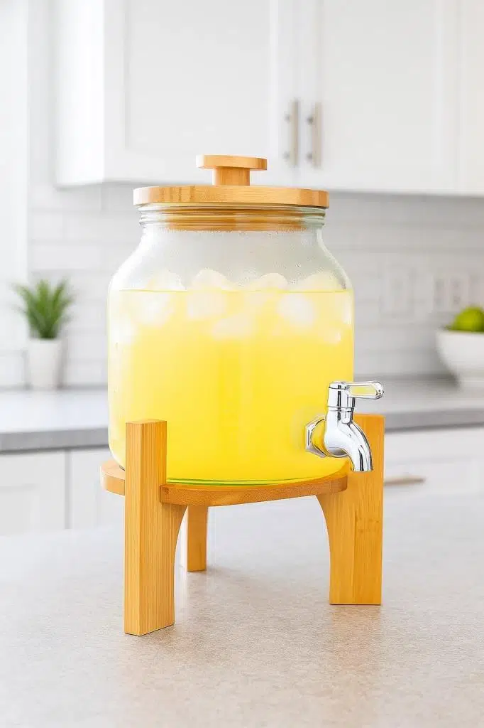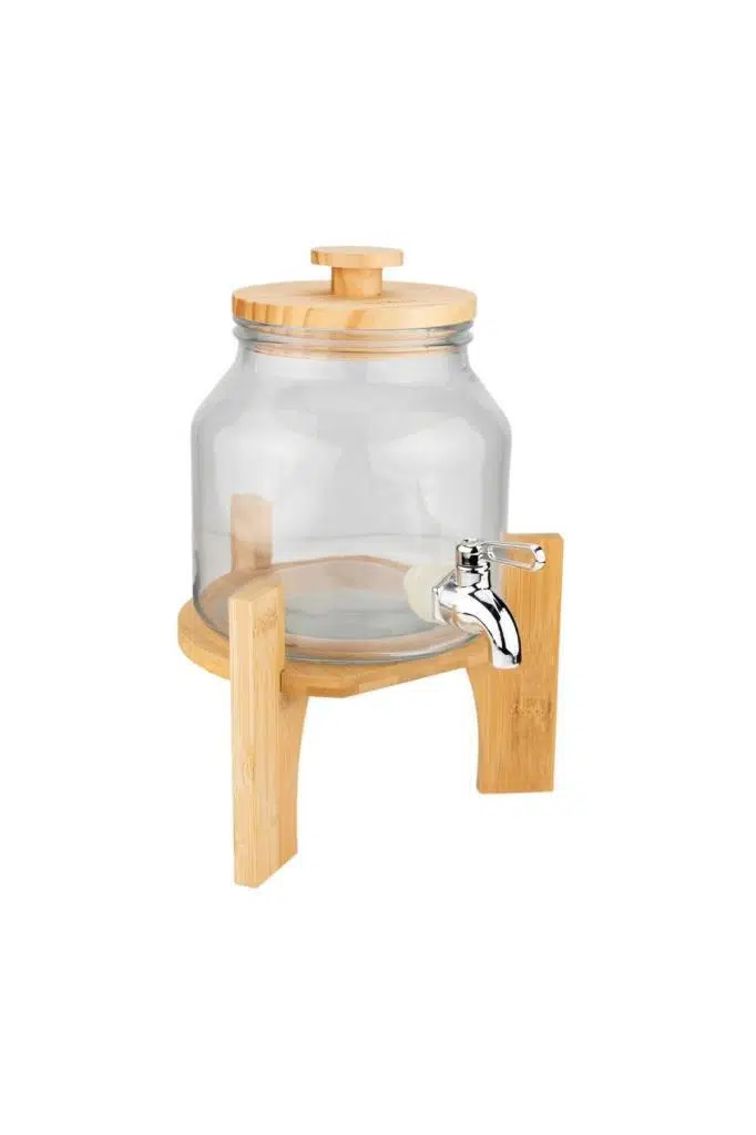 bambum cam sebil, 1.5 litre cam sebil, ahşap kapaklı sebil, bambu standlı sebil, cam limonata sebili, içecek sebili, kompakt cam sebil, günlük kullanım sebili
