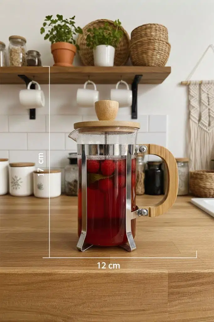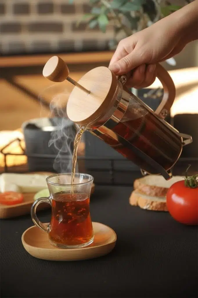 Malzeme: Isıya dayanıklı cam gövde, paslanmaz çelik metal iskelet/filtre ve doğal bambu kapak/kulp.