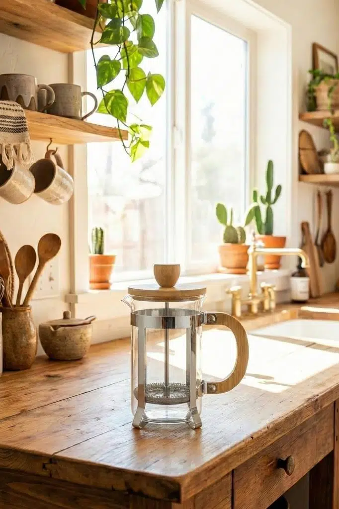 Doğal Dokunuş: Standart plastik veya tamamen metal preslerin aksine, bambu sap ve kapak detayları ürüne sıcak, rustik ve "cozy" bir hava katar.