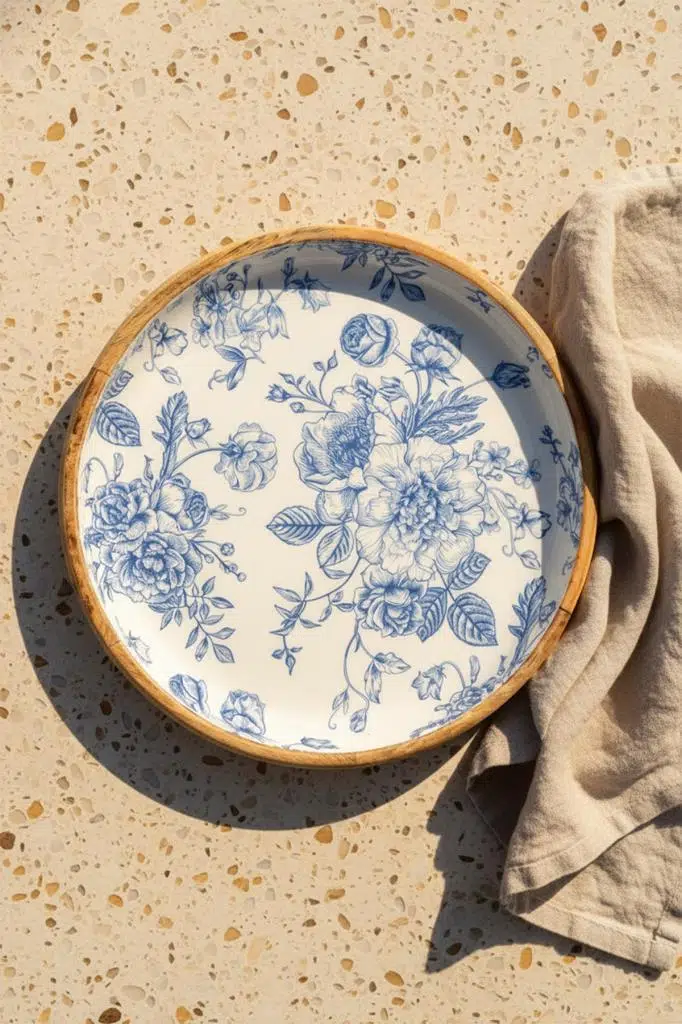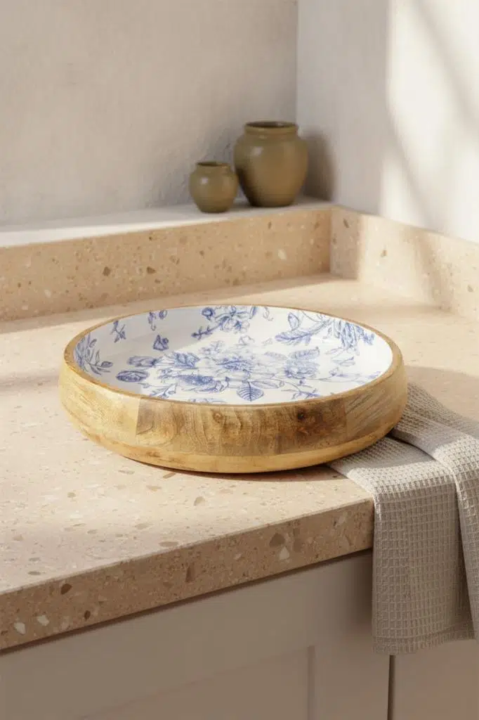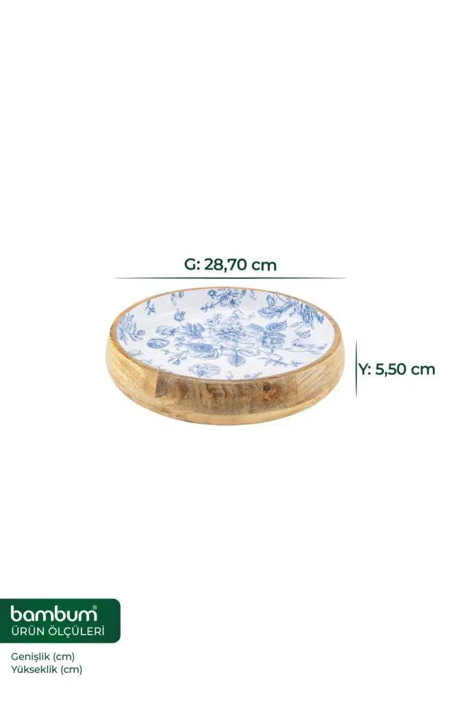 Nostaljik ve Rustik Uyum: Mango ağacının bohem ve topraksı tonları ile çini sanatını andıran zarif mavi desenlerin yarattığı güçlü kontrast, her tarz masa düzenine zengin ve estetik bir kimlik kazandırır.