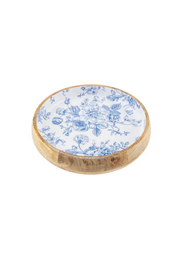 Tasarım: İç yüzeyi parlak beyaz zemin üzerine işlenmiş vintage esintili klasik mavi gül (floral) desenleriyle kaplı, dışı ve kalın kenarları ise natürel sıcak ahşap görünümlü.