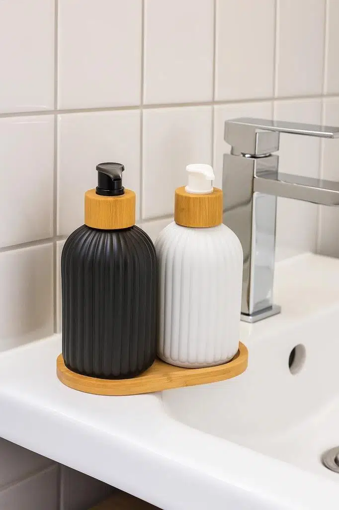 bambu sabunluk, 2’li sıvı sabunluk seti, cam sabunluk, bambum sıvı sabunluk, mutfak sabunluk, banyo aksesuarı, şık sabunluk seti, çevre dostu sabunluk
