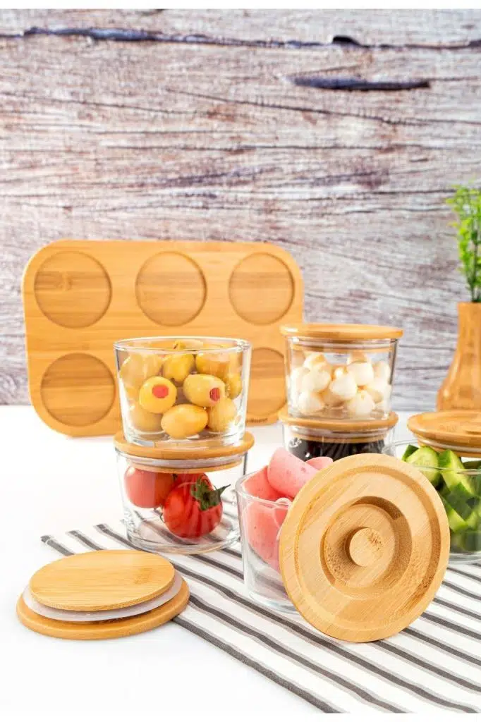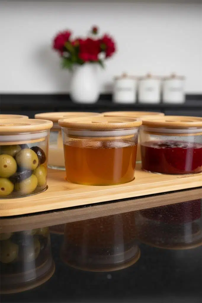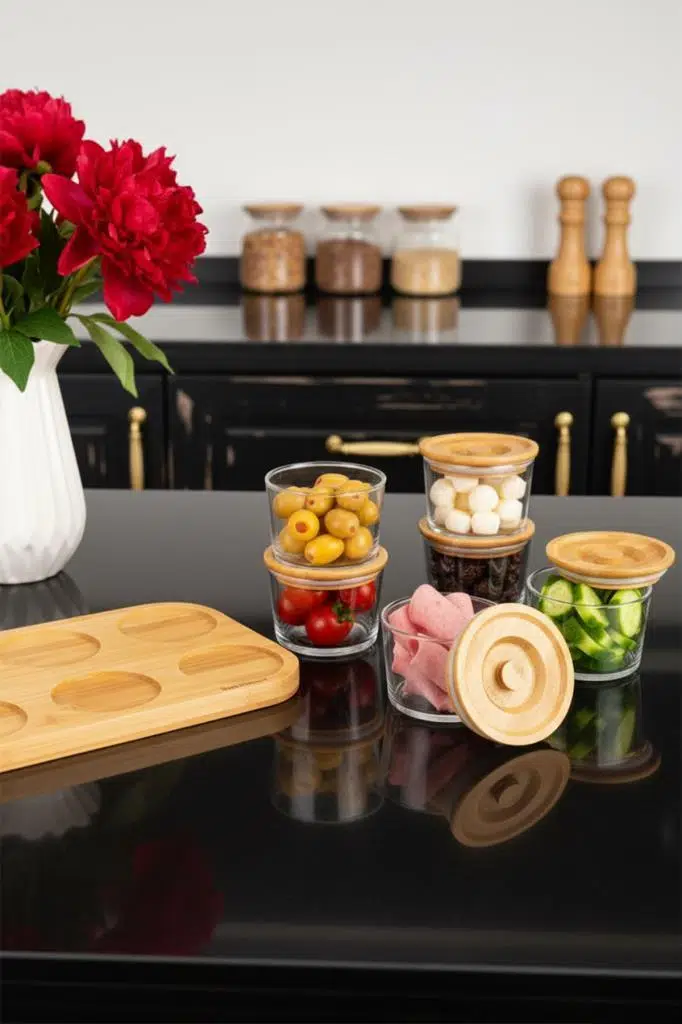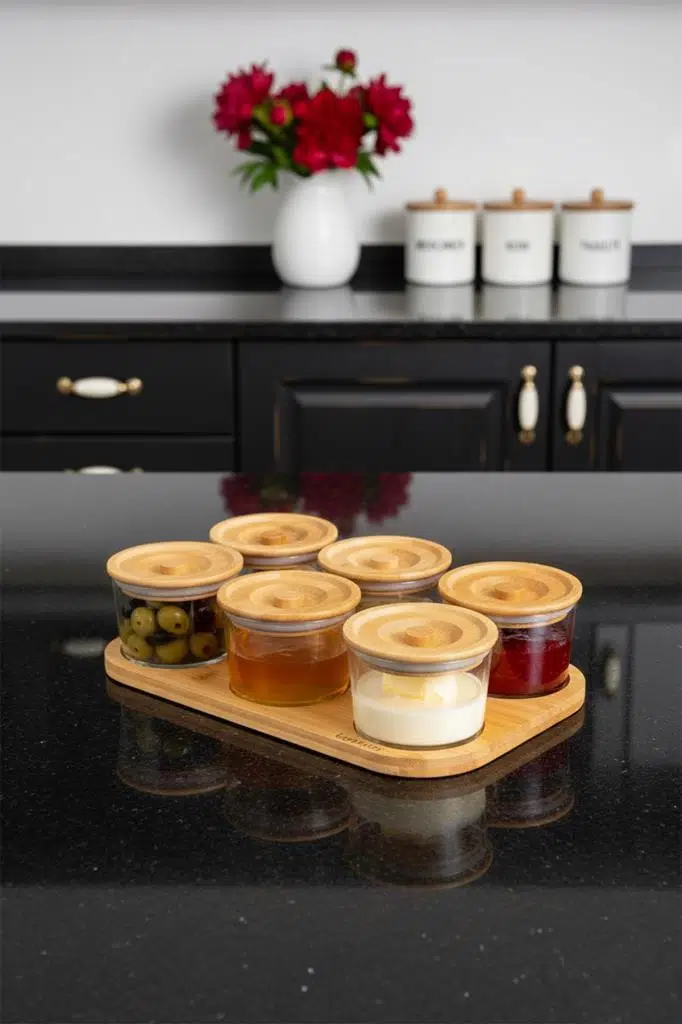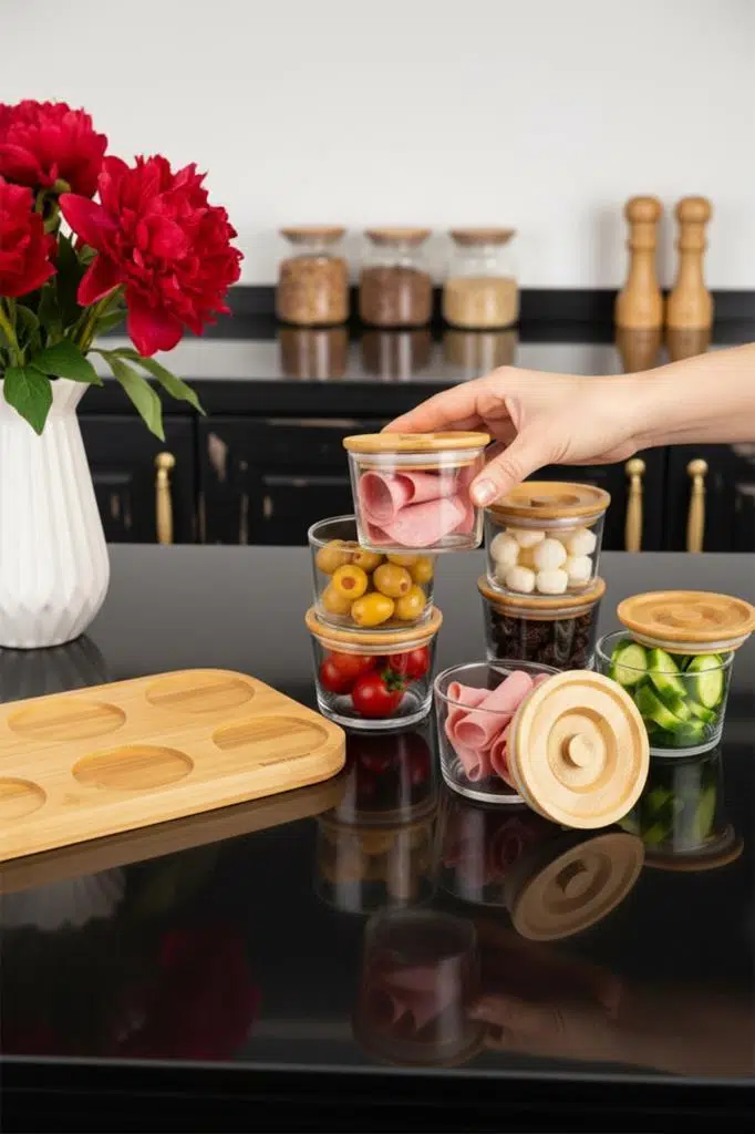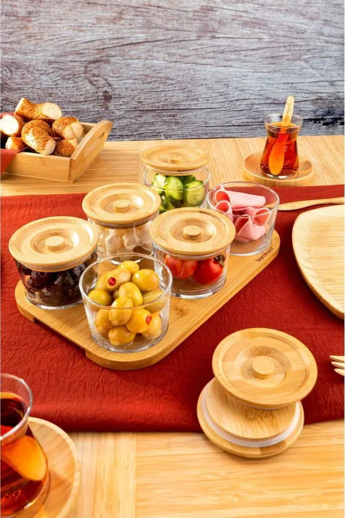 Bambum Lincoln 13 Parça Cam Kahvaltılık Takımı, şıklığı ve işlevselliği bir araya getirerek sofralarınıza doğal bir zarafet kazandırır. 6 adet cam saklama kabı, her biri için özel bambu kapaklar ve hepsini bir arada tutan şık bambu tepsisiyle kahvaltı sofralarınızı düzenli ve estetik hale getirir. Cam kaselerde reçel, zeytin, bal veya peynir gibi kahvaltılıklarınızı hijyenik şekilde saklayabilir, bambu kapaklar sayesinde tazeliğini uzun süre koruyabilirsiniz.