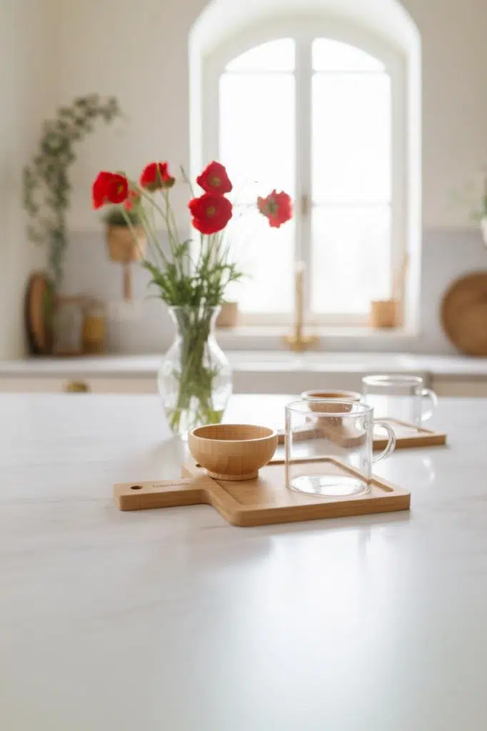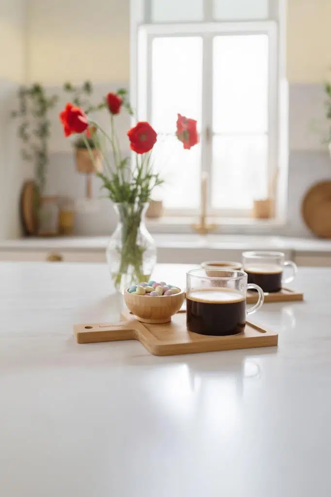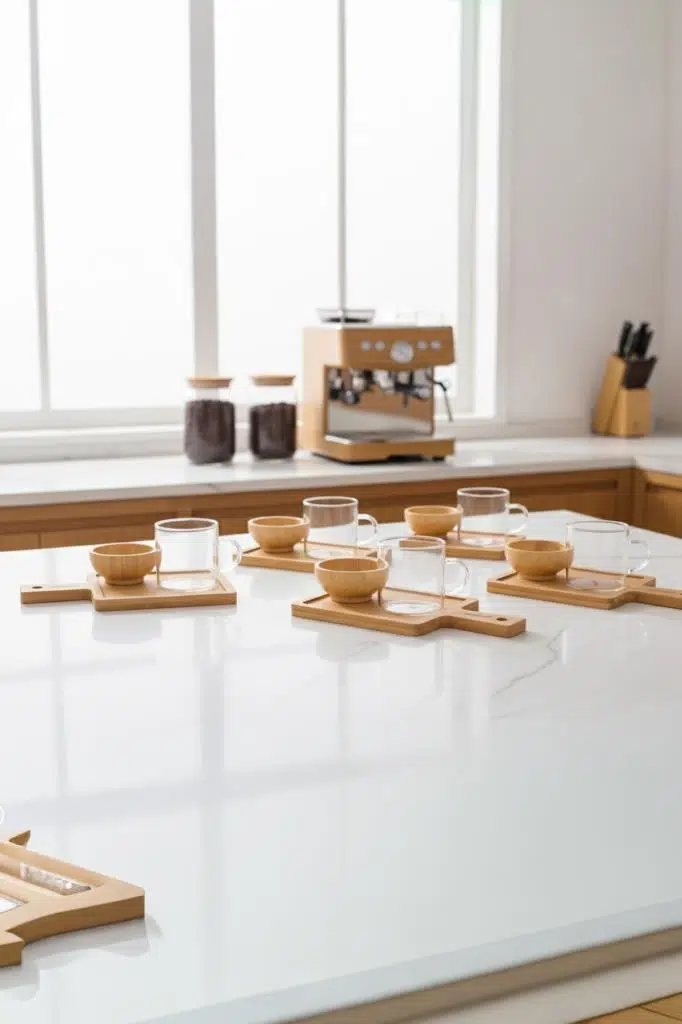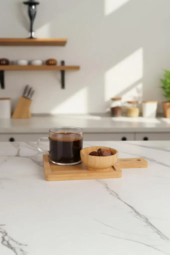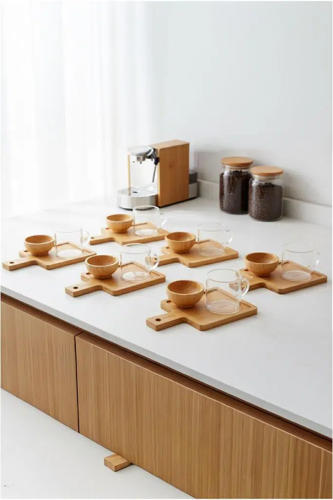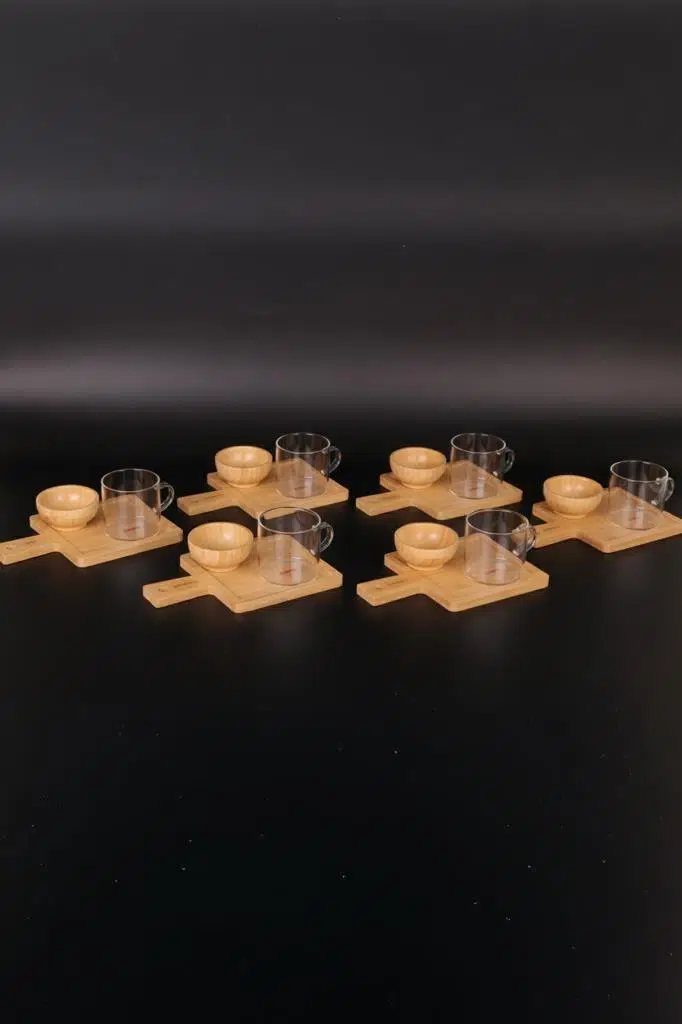 Tasarım: Modern ve doğal. Bambunun sıcak dokusu, camın şeffaf zarafetiyle buluşuyor. Sunum altlıkları, hem bardak hem de kase için ergonomik bir alan sunar.
