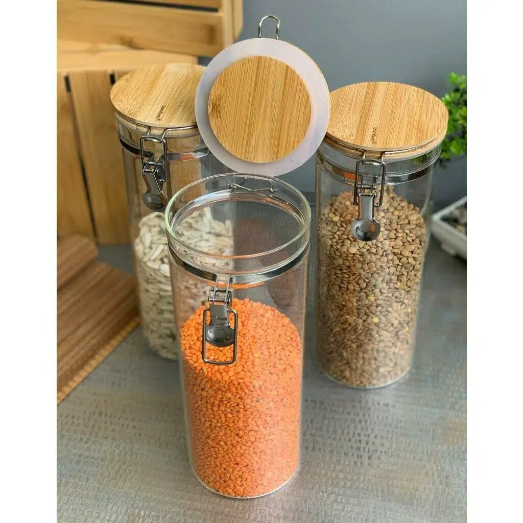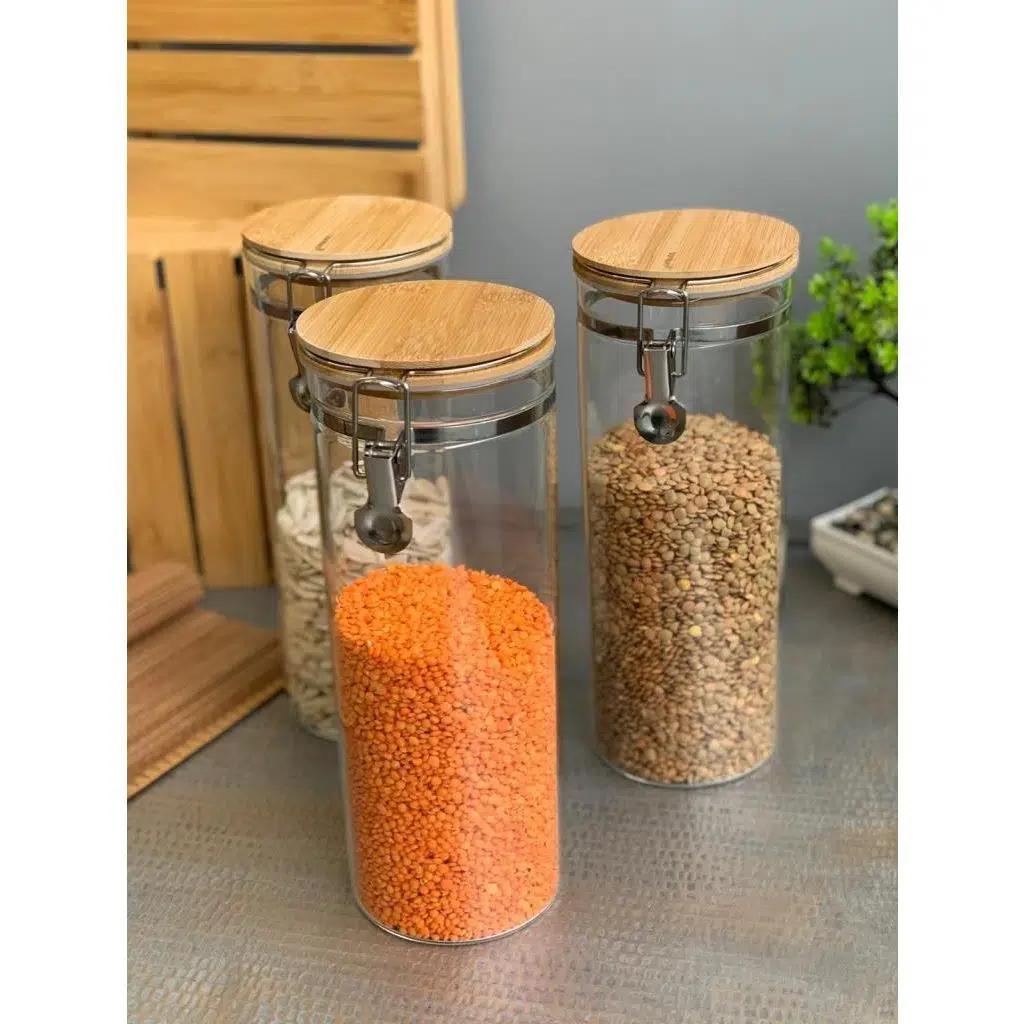 Set İçeriği: 3 adet borosilikat cam saklama kabı + 3 adet kelepçeli vakumlu kapak