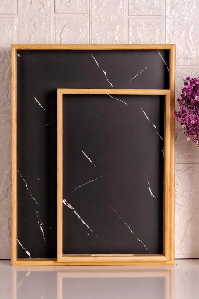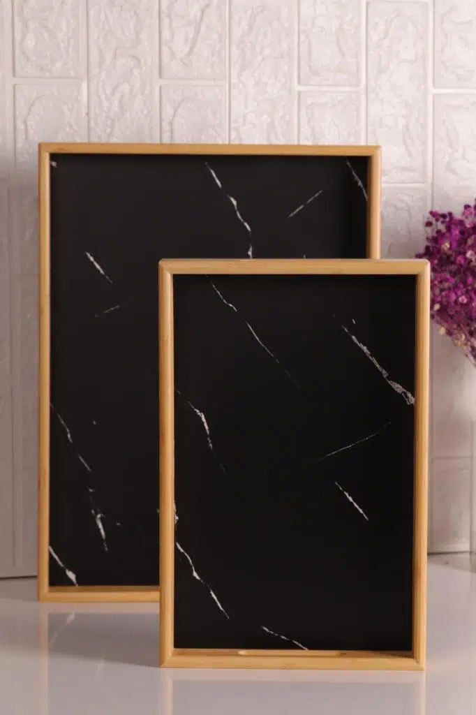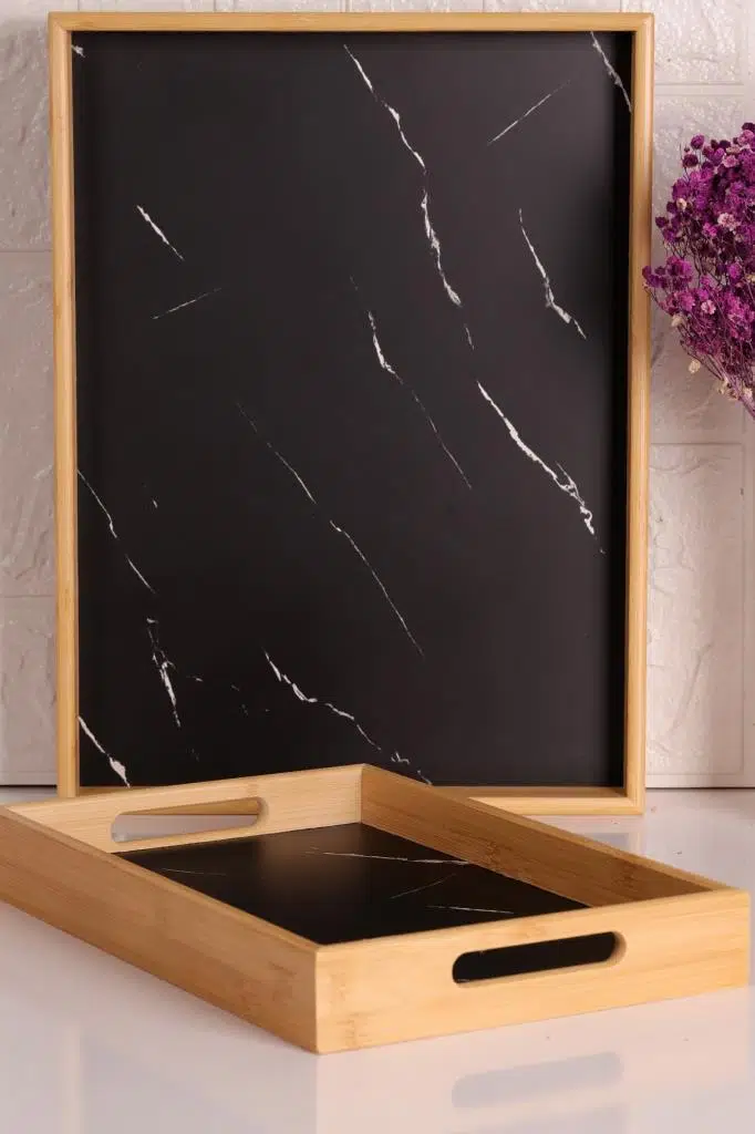 Bambum Marbella tepsi seti, 2’li siyah mermer desenli tepsi, büyük küçük servis tepsisi, şık sunum tabakları, modern mutfak tepsisi, dekoratif servis tepsisi