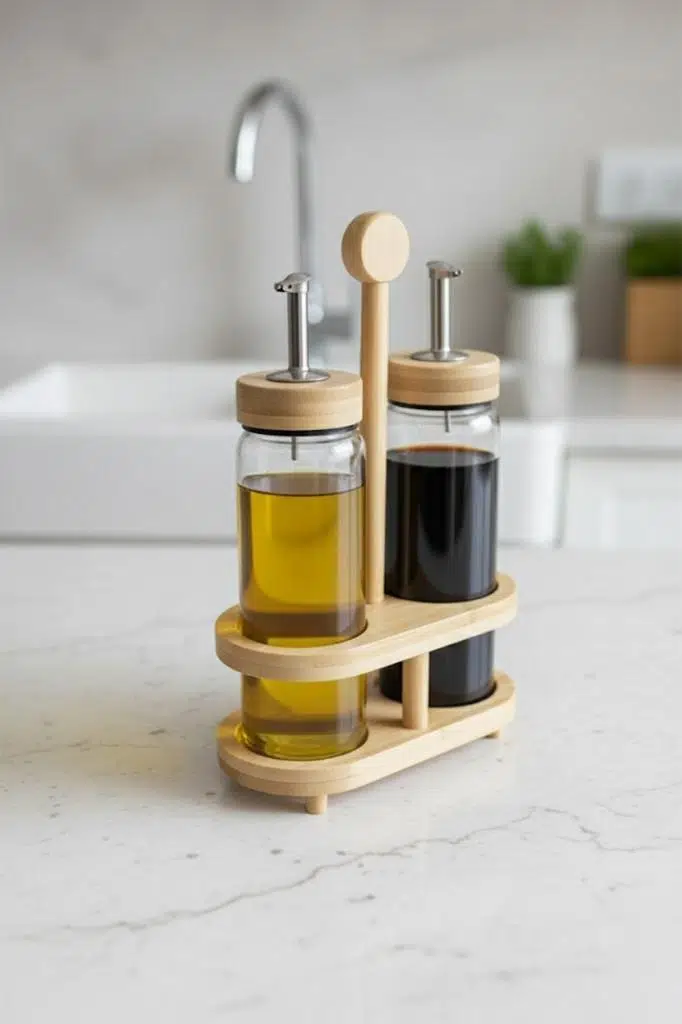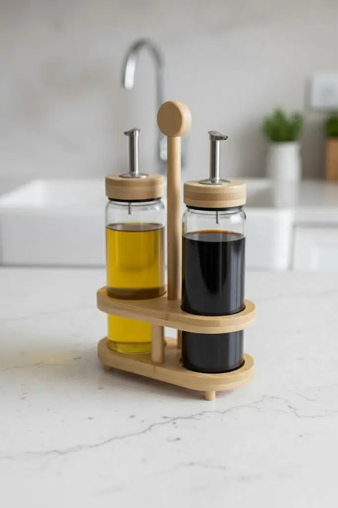 Düzenli ve Şık Sunum: Bambu stand, yağdanlıklarınızı bir arada tutarak tezgahınızda düzenli ve sofistike bir görünüm yaratır.