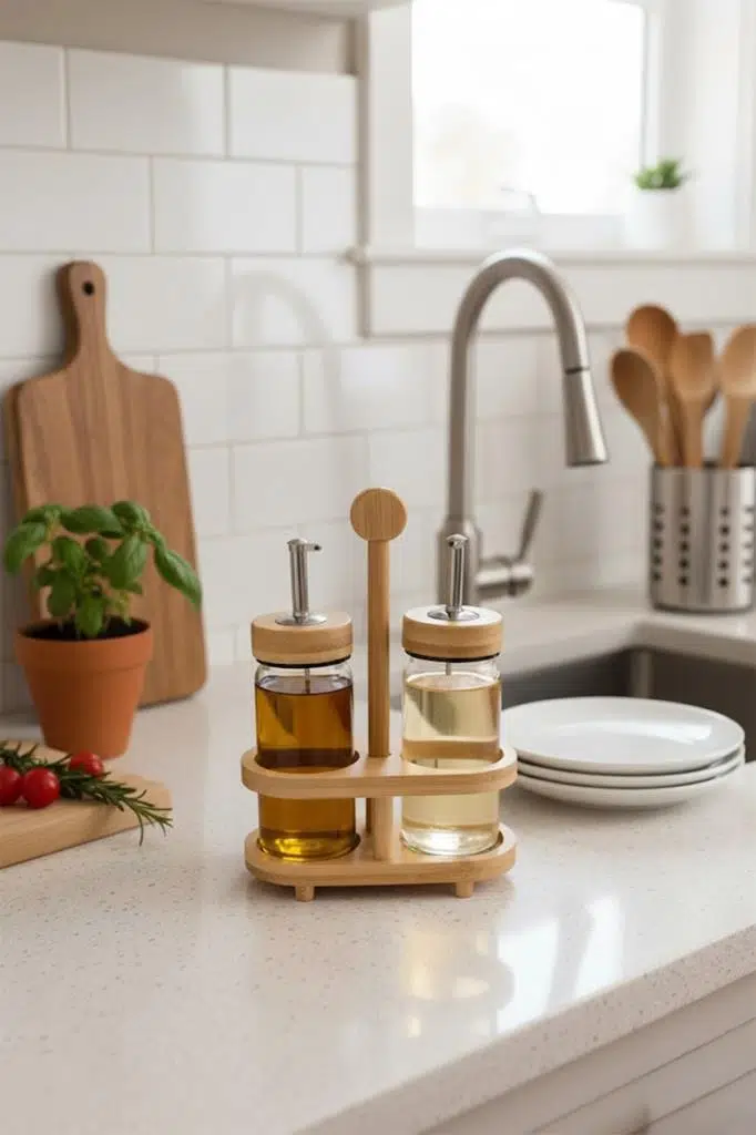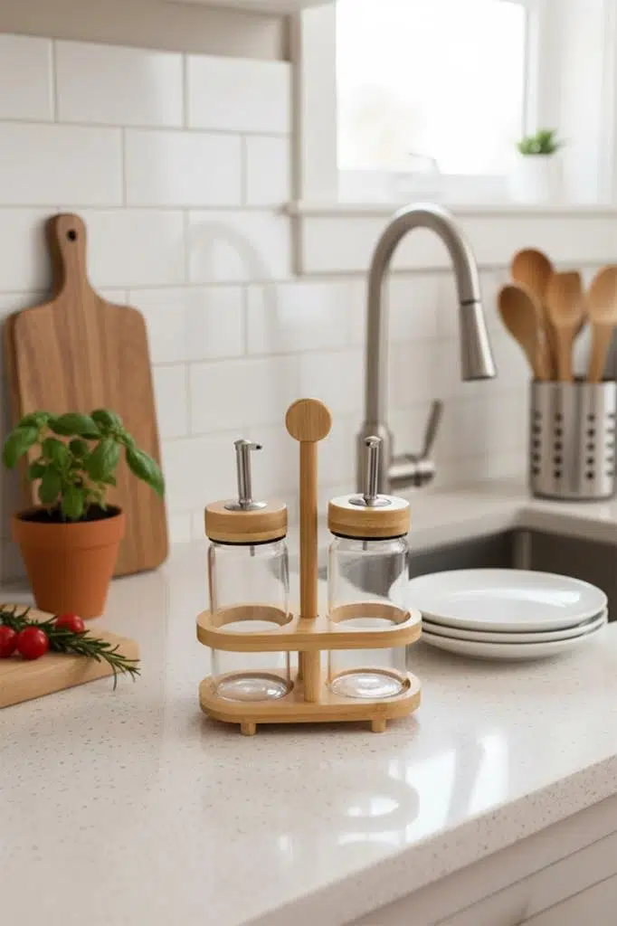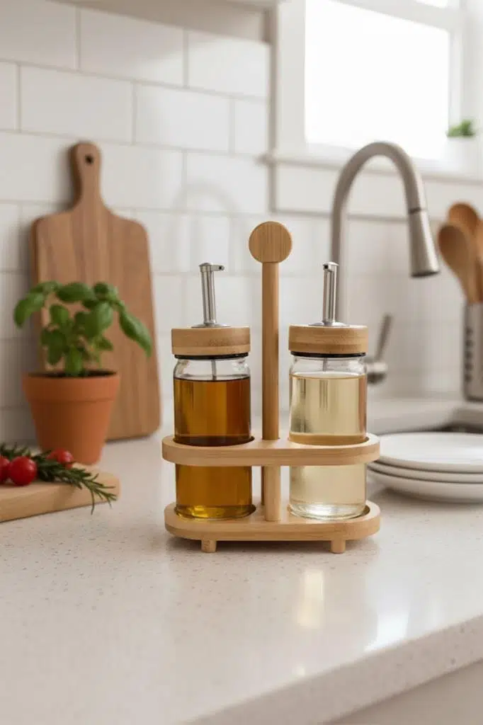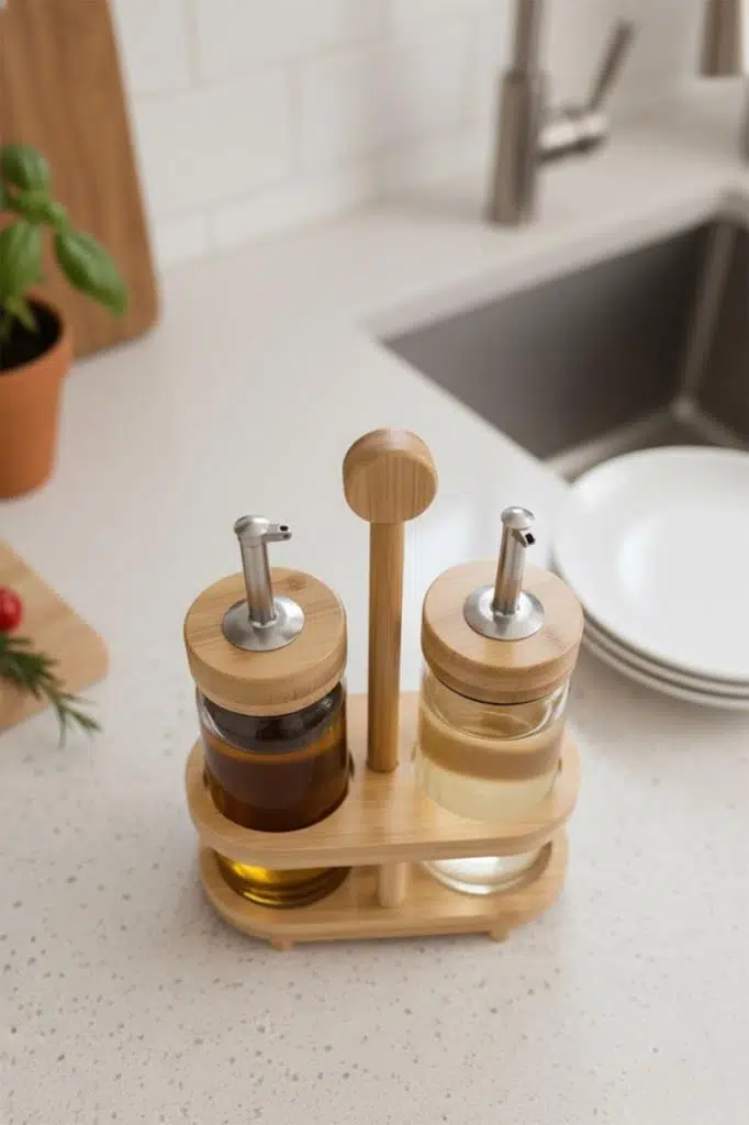 Düzenli Sunum: Bambu stand, yağdanlıklarınızı bir arada tutarak tezgahınızda veya masanızda düzenli ve sofistike bir görünüm yaratır.