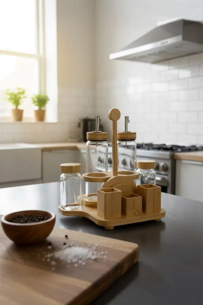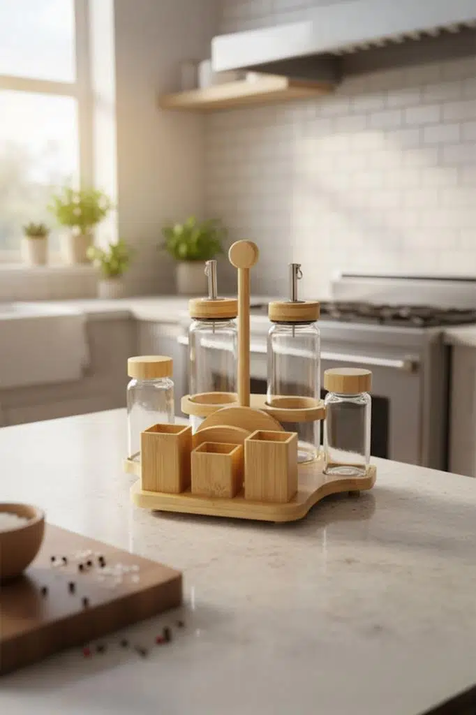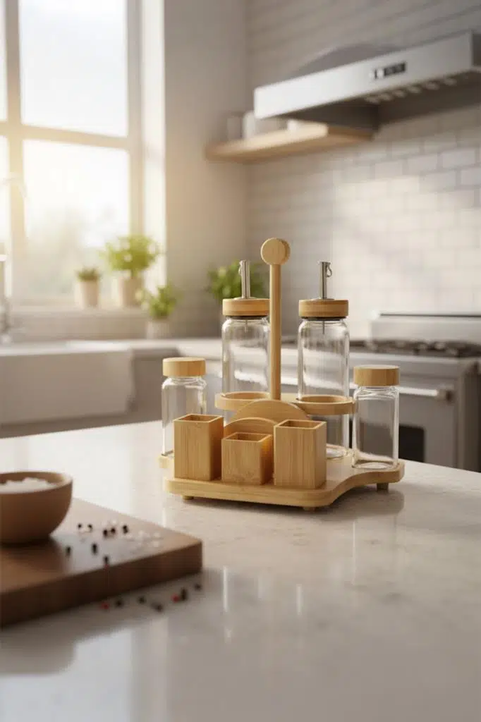 Tasarım: Sofra veya tezgah üzerindeki tüm temel ihtiyaçları (yağ, sirke, tuz, biber, peçete) tek bir şık stant üzerinde toplayan çok fonksiyonlu tasarım.