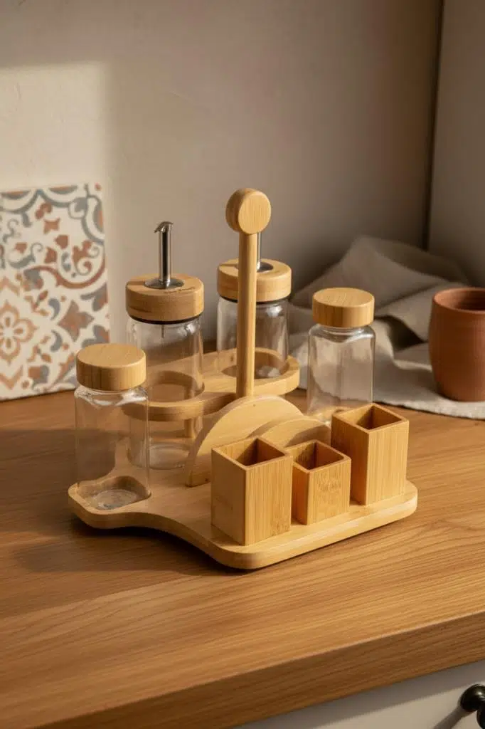 menaj takımı, peçetelikli baharatlık, yağlık sirkelik seti, bambu menaj takımı, Bambum Mima, mutfak düzenleyici, sofra servis seti, tuzluk biberlik takımı, entegre baharatlık, cam yağdanlık