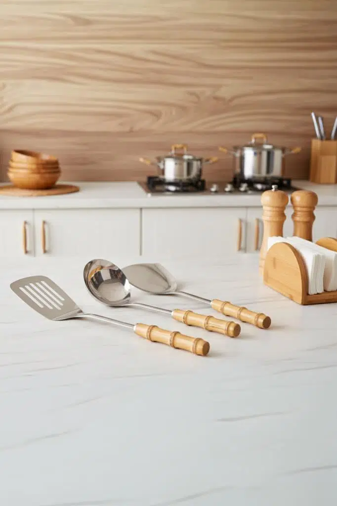 Şık ve Fonksiyonel: Mutfakta en çok ihtiyaç duyulan üç temel gereci (kaşık, kepçe, kevgir) tek bir uyumlu ve şık sette sunar.