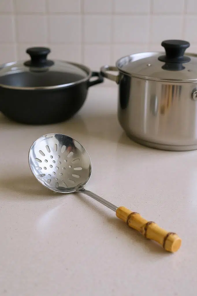 bambum mundo süzgeç, bambu saplı süzgeç, mutfak süzgeci, bambu mutfak gereçleri, bambu kaşık süzgeç, sağlıklı mutfak ürünleri, paslanmaz metal süzgeç, uzun saplı süzgeç