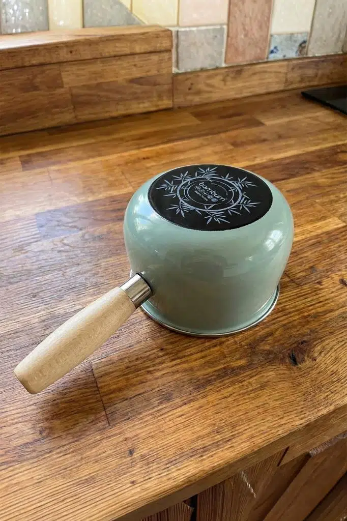 Bambum Nostalji - Ahşap Saplı Emaye Sos Tavası / Sütlük Açık Yeşil 14 Cm | 1.2 Lt