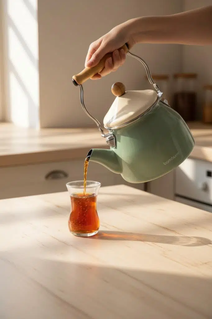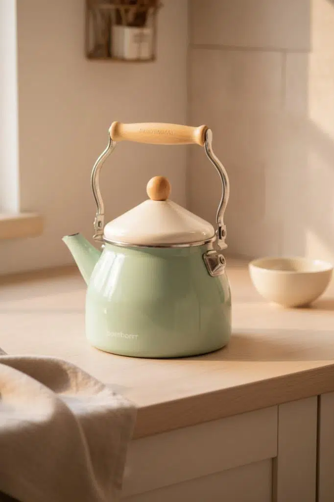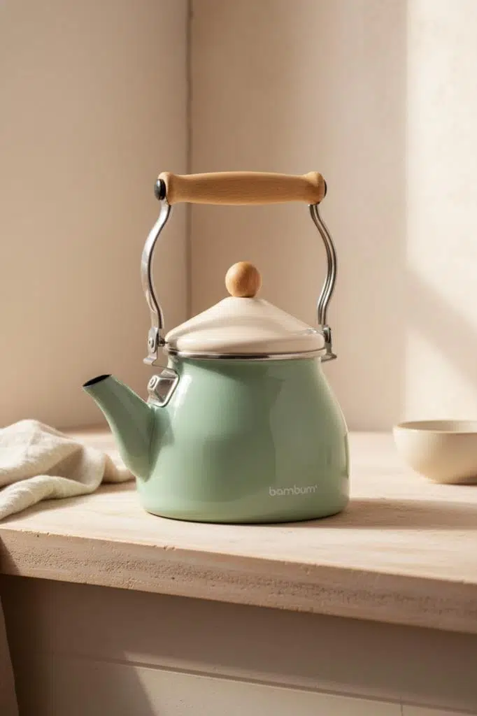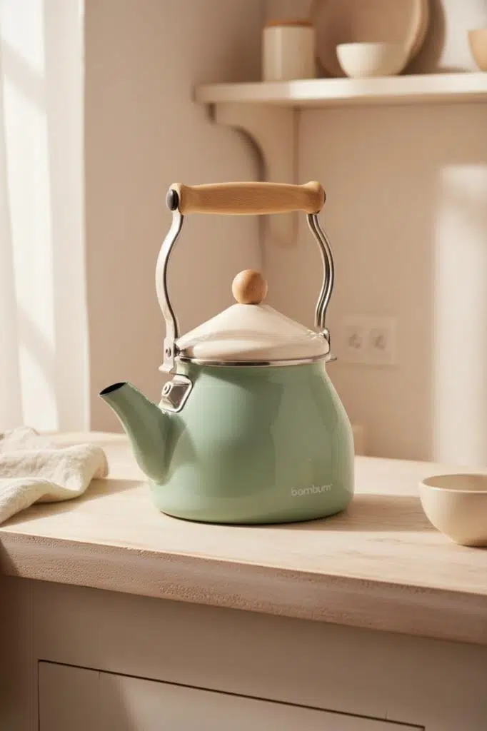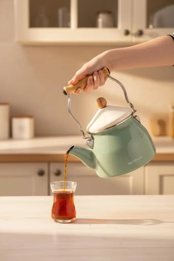 Bambum Nostalji - Ahşap Saplı Emaye Kettle & Demlik | Açık Yeşil Retro Şıklık (1.7 Litre)