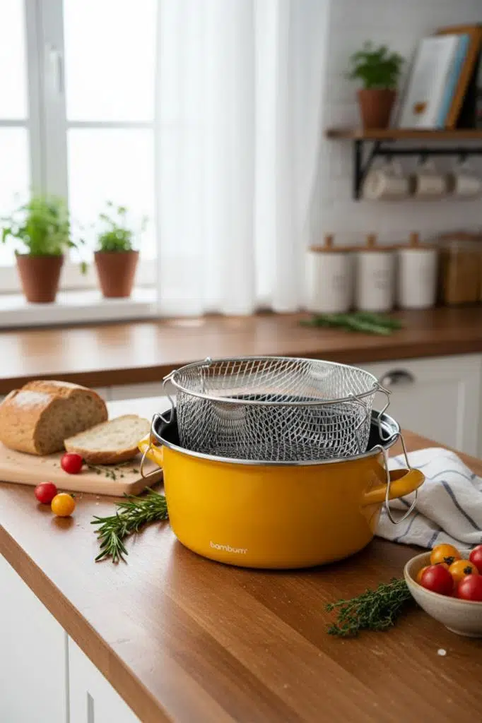 kızartma tenceresi, emaye tencere, fritöz tenceresi, sepetli kızartma tenceresi, Bambum Nostalji, hardal tencere, sarı tencere, 22 cm tencere, patates kızartma tenceresi, retro mutfak, emaye kızartma