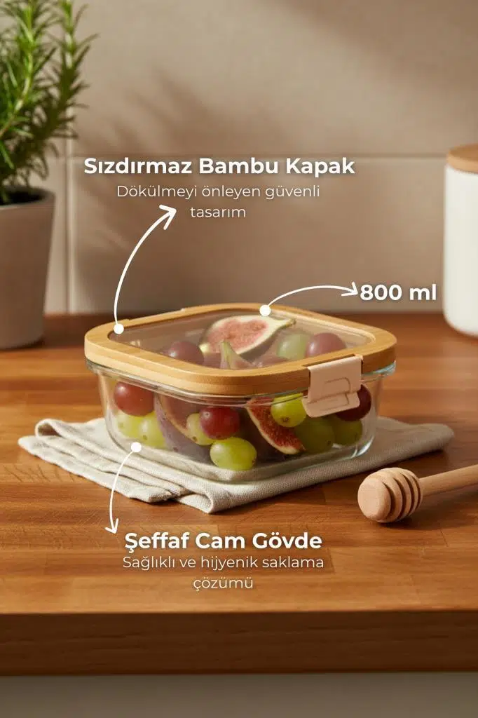 Standart saklama kaplarının aksine, bambu çerçeveli kapağının ortasındaki cam pencere sayesinde, kabı buzdolabından çıkarmadan veya kapağını açmadan içerisinde ne olduğunu kuş bakışı görebilirsiniz. Hem "Meal Prep" (öğün hazırlığı) yapanlar hem de buzdolabı düzenine önem verenler için vazgeçilmez bir parçadır.