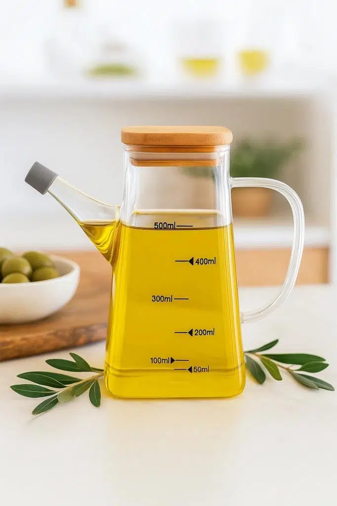 bambu kapaklı yağdanlık, cam yağ şişesi, 500 ml yağ şişesi, Bambum yağlık, zeytinyağı şişesi, mutfak için cam yağdanlık, doğal bambu kapak, sağlıklı cam saklama kabı, modern yağdanlık, şık sofralık yağlık